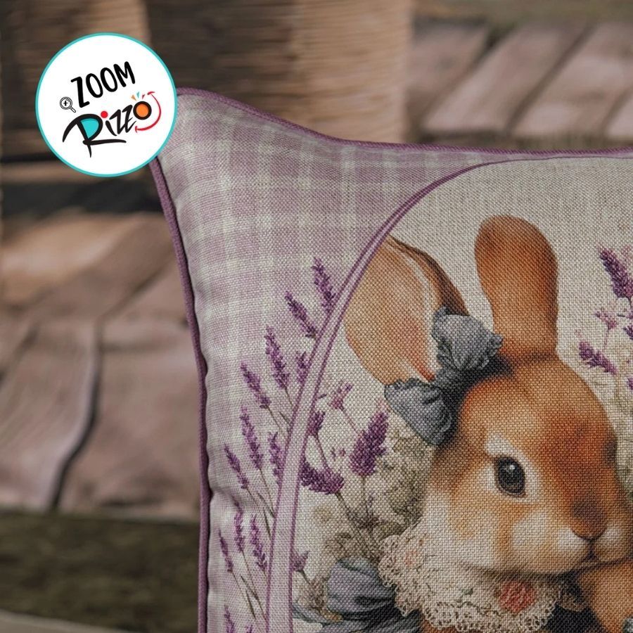 Capa para Almofada de Páscoa Premium - Coelhinhas de Vestido no Campo de Lavanda - Xadrez Lilás - 43x43cm - 1 unidade -