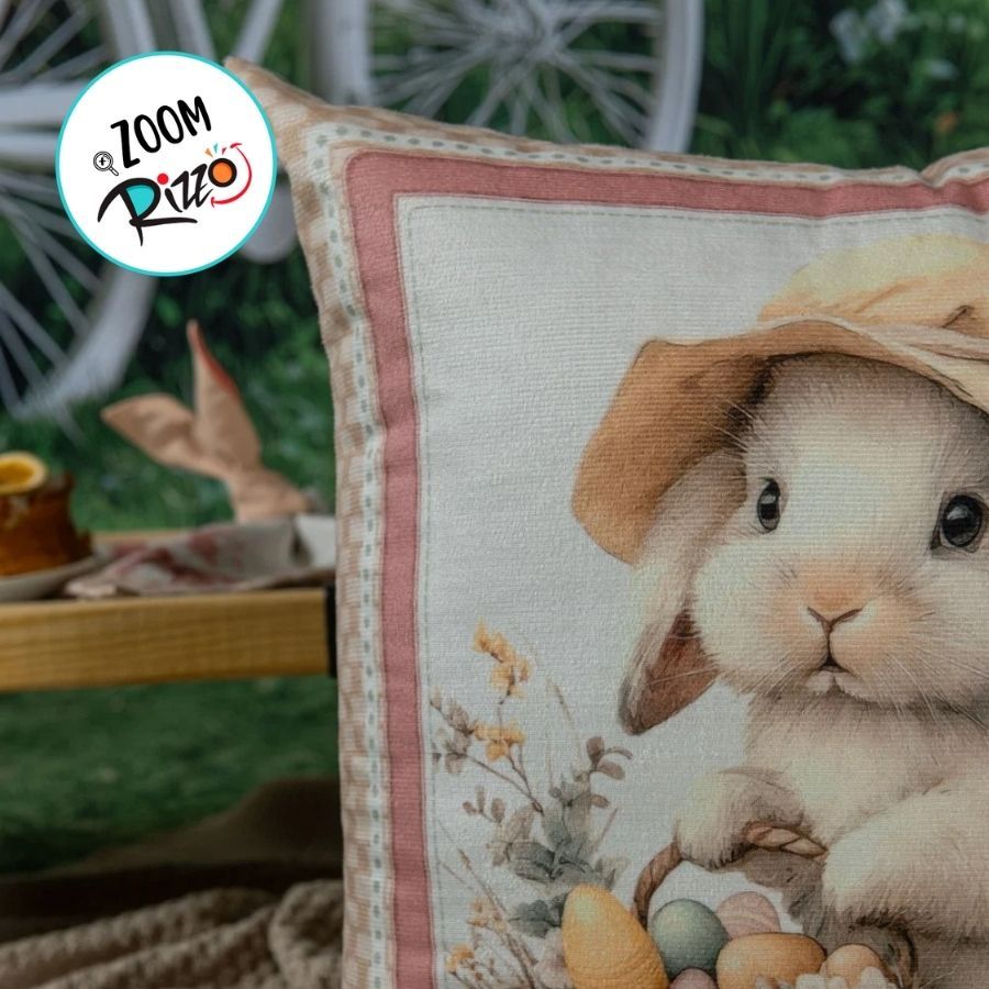 Capa para Almofada de Páscoa Premium - Coelhinho Chapéu e Cesta de Ovos - Tons Pastéis - 43x43cm - 1 unidade - Rizzo