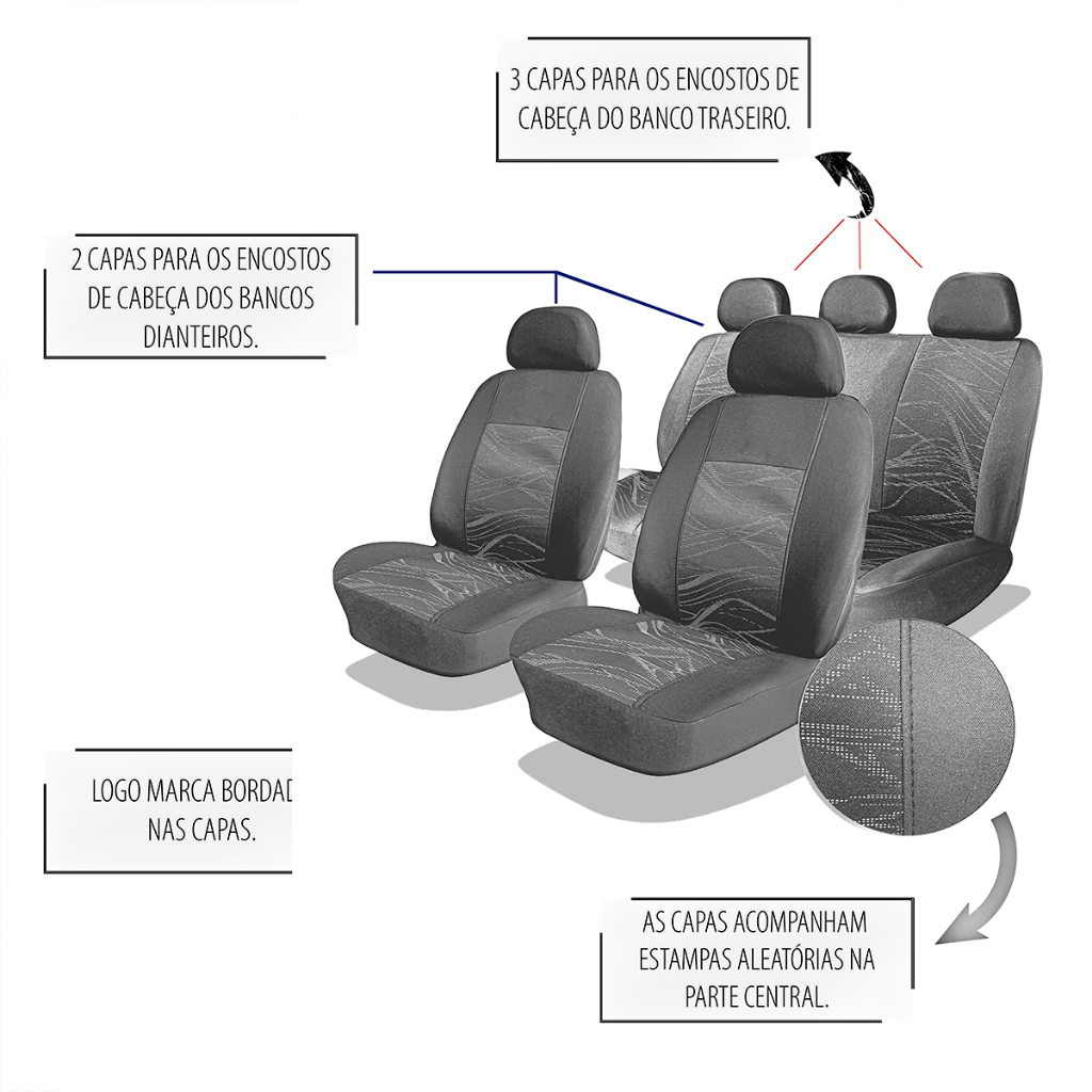 CAPAS DE BANCOS ORIGINAL GROSSA A MESMA QUE VEM DE FÁBRICA NOS CARROS ATENÇÃO: Por ser a capa Original não há possibilidade de escolher o tipo de estampa, a capa vai toda preta, com estampa discreta no centro da capa. Você vai adorar e se impressionar com a qualidade do material. Mantém os bancos originais de fábrica do seu automóvel. Tecido Original é o mesmo tecido que as montadoras usam na fabricação de seus carros, ou seja, você comprando um carro hoje que tenha banco feito de tecido, esta capa o mesmo material dele. É um Tecido Grosso que possui 3 camadas, O tecido grosso, espuma e um forro. Proteção contra sujeiras, manchas, rasgos e furos que na maioria das vezes é causado involuntariamente por crianças animais domésticos entre outros. CONTEÚDO DA EMBALAGEM: 2 Capas para bancos dianteiros 1 Capa para o assento traseiro 1 Capa para o encosto traseiro 4 Capas Encostos para o apoio de cabeça MATERIAL DA CAPA: MALHARIA ORIGINAL • Composição: 67 % Poliéster e 33 % Viscose; • Devido à sua composição, é uma malha muito leve; • É uma malha com grande durabilidade e que proporciona muito conforto; Para qualquer dúvida utilize o campo de mensagens para que possamos tirar, responderemos o mais rápido possível.