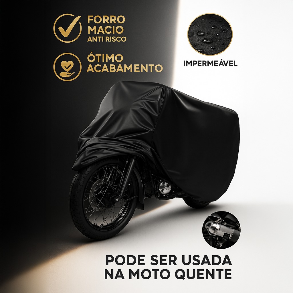 A Capa Moto Impermeável Cobrir Forrada Para Térmica Sol Chuva da marca LG-CAPAS AUTOMOTIVAS é a solução ideal para proteger sua moto contra as intempéries. Com um design robusto e funcional, esta capa oferece proteção completa contra a chuva e os raios UV, garantindo que seu veículo permaneça em ótimo estado, independentemente das condições climáticas. Fabricada em 100% Couro Preto, a capa é resistente e durável, proporcionando uma camada extra de segurança. Com dimensões de 30 cm de comprimento e 20 cm de largura, ela se adapta perfeitamente ao seu veículo, oferecendo um ajuste seguro e eficaz. Além de sua impermeabilidade, a capa é forrada termicamente, o que ajuda a manter a temperatura interna do veículo, protegendo-o do calor excessivo e do frio. A praticidade e a eficiência deste produto fazem dele uma escolha indispensável para quem valoriza a preservação de sua moto. Invista na proteção do seu veículo com a Capa Moto Impermeável da LG-CAPAS AUTOMOTIVAS e desfrute de tranquilidade em qualquer clima. A qualidade e a resistência deste produto garantem que você estará sempre preparado para enfrentar as condições climáticas adversas. SELECIONE A OPÇÃO TAMANHOS ""ANTES DE CLICAR EM COMPRAR"". TAMANHO P - BIZ 110 CC ___________- BIZ 125 CC - BURGMAN 125________- C 100 ES - CRYPTON 105________- ELITE - LEAD 110 ____________ - MAX 125 - NEO 125_____________ - PHOENIX 50 CC - POP ________________-WIN 110 - PCX (TODAS)__________ TAMANHO M - CG TODAS AS VERSÕES E MODELOS - FACTOR - TITAN - FAN - TODAY - YBR 125 - YES 125. - FAZER 150 TAMANHO G - CBR 650 F__________- CB 1000 - CB 300 ___________- CB 600 - CB 500F ___________- XMAX - CB 650F ___________- CBR 1000 - CB 250 TWISTER ____________- CHOPPER ROAD150 - COMET 250_________-NMAX - DUKE 390 __________- DUKE 200 - ER6 _______________- Z750/800/900 - FAZER 250__________- NINJA 250 - GSX 750 - INTRUDER 125_______- VIRAGO 250/535. - MIRAGE 150_________- MT 03 - NEXT ______________- R1 - NINJA 300__________- NINJA 400 - R3 ________________- R6 - SRAD 750 __________- SRAD 1000 - DAYTONA___________- XJ6 N - Z 300______________- Z 400 - ZX 6_______________- ZX 10. - COMET GT650 R - CRF 250 _____________- CRF 230 - CROSSER ____________- DT 200 - GS650 - GSR 750 _____________- GSR 1000 - GSX 650F ____________- GSX 1000 -INAZUMA 250 - MT 07 _______________ - MT 09 - NINJA 600____________ - NINJA 650 - Z 1000 ________________- Z 650 - Z 750 _________________- Z800 - Z900 _________________- ZR6 sua moto não esta na lista , pergunte qual modelo é compatível informando a moto. Capa GG disponível em outro anuncio, ideal para trail e big trail Cor : • Preta Especificação Técnica: • Confeccionada em CORINO COM FORRAÇÃO EM MANTA MACIA. • Lado externo couro sintético Impermeável resistente a sol e chuva • Lado interno macio manta protetora resistente a temperatura • Não Risca a Pintura da Moto. • Ideal para qualquer ambiente. • Proteção Contra Raios Ultra Violeta. • 100% Impermeável. • Não utilizar para cobrir veículos em transporte.