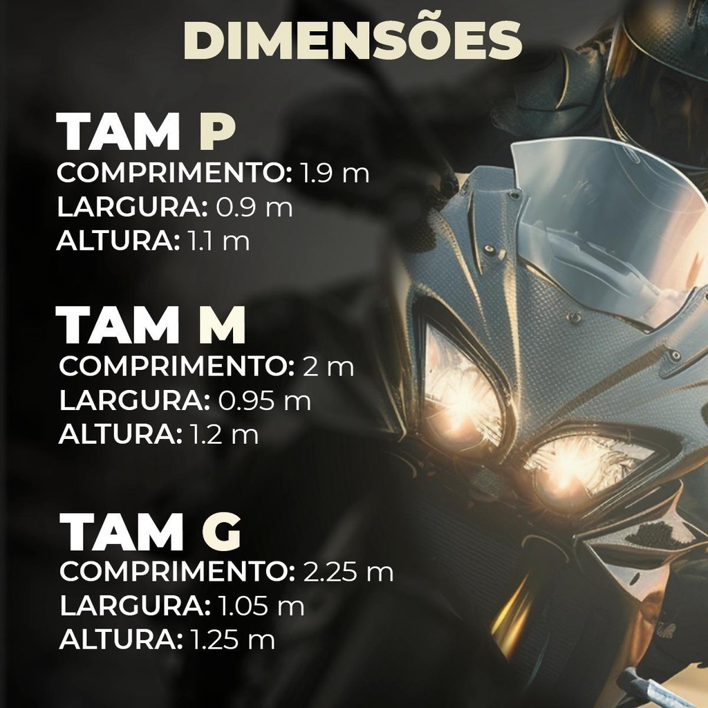 PRONTA ENTREGA! 3 Meses de Garantia! Capa para Moto Motoqueiro Proteção Contra Chuva Sol Poeira Proteja sua moto com esta capa de alta qualidade, projetada para resistir aos elementos e garantir a segurança do seu veículo. Feita com materiais duráveis e resistentes, esta capa oferece uma camada de proteção contra chuva, sol e poeira, mantendo sua moto em ótimas condições por mais tempo. Fabricada com materiais de alta qualidade, esta capa é resistente a rasgos e abrasão, garantindo durabilidade e proteção prolongada para sua moto. O forro no interior da capa protege a pintura e os acabamentos da sua moto contra arranhões e danos. Especificações: - Modelo: KP-MSA002 - Possui Forro - Não risca a pintura da moto. - Ideal para qualquer ambiente. - Fácil Colocação. Tamanhos: P - 1.9M x 0.9cm x 1.1M (CxLxA) M - 2M x 0.95cm x 1.2M (CxLxA) G - 2.25M x 1.05M x 1.25M (CxLxA) Composição: 100% polietileno Itens Inclusos: 1 Capa Protetora