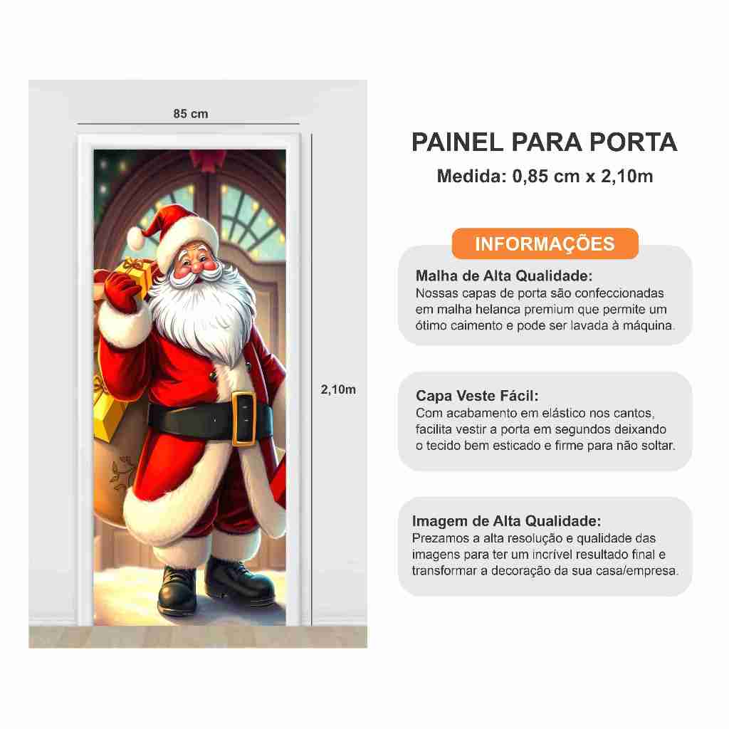 Características LAVI IMPRESSÃO DIGITAL CAPA DE PORTA EM MALHA PREMIUM TAMANHO VERTICAL: 2,10 de Altura x 0,85 cm de Largura ACABAMENTO EM ELÁSTICO (Veste Fácil) ATENÇÃO: 1. VENDEMOS APENAS O TECIDO SUBLIMADO! NÃO ACOMPANHA SUPORTE E NEM ESTRUTURA! 2. NÃO FAZEMOS ALTERAÇÃO DE MEDIDA E NEM DE ARTE NOS ITEM DESTE ANÚNCIO. VERIFIQUE AS MEDIDAS ANTES DE FINALIZAR A COMPRA. DESCRIÇÃO: NOSSOS PAINÉIS, CAPAS DE PORTA E FUNDOS FOTOGRÁFICOS NÃO POSSUEM EMENDA!!! Capa Decorativa para Porta produzida em malha helanca de alta gramatura e sublimada em alta resolução. DECORE A PORTA DA SUA CASA COM MUITO ESTILO E BOM GOSTO E COM UM BELO AR DE BOAS VINDAS! IMAGENS ANUNCIADAS COMO 3D: São imagens ilustrativas, geradas por inteligencia artificial, contendo alguns detalhes não editáveis, podem aparecer partes nitidas ou desfocadas, ou com pixels destorcidos que nossos olhos não enxergam. SOBRE EFEITOS – GLITTER, MADEIRA, LANTEJOULA, 3D, 4K, 8K: São efeitos que não podem ser visto a olho nu, somente por trás das lentes das cameras. Todos os nossos produtos são impressões em tecido, dessa forma não possuem glitter, lantejoulas e nem folhagens, é uma impressão em tecido que simula esses efeitos. PRAZO DE POSTAGEM: Todas as compras são enviadas após a liberação do pedido pela Shopee em até 48 horas úteis e algumas compras enviamos no mesmo dia. Os prazos de entrega variam de acordo com o seu CEP. PRAZO DE RECEBIMENTO: Tudo relacionado a frete é informado pela Shoppe, que costuma cumprir os prazos informados no ato da compra. A ENTREGA É RESPONSABILIDADE DA MESMA. INFORMAÇÕES IMPORTANTES: * A cor do Painel pode variar devido a configurações de brilho e contraste do monitor ou celular onde a imagem está sendo visualizada, também pode dar a impressão das cores serem mais ou menos vivas e mais ou menos intensas. * BENEFÍCIOS: - Acabamento em overloque, para não desfiar o tecido; - Não reflete luz do flash; - Pode ser lavado e por ter baixa absorção de água, seca rapidamente; - Pode ser passado a ferro em baixa temperatura; - Fácil transporte e armazenamento; - Fácil de guardar, pode ser dobrado e tem pouco volume; - Não amassa com facilidade. É flexível apenas o suficiente, mas as fibras do tecido sempre voltam para o estado original e é isso que garante que não deforma com o passar do tempo; - Alta gramatura que garante transparência mínima no branco e nas cores claras; - Alta durabilidade; - Não perde coloração ________________________________________________________________________________________________________ ***PRINCIPAIS DÚVIDAS*** ACOMPANHA A ESTRUTURA: -NÃO acompanha estrutura/suporte, o anúncio é referente somente ao tecido impresso! PERSONALIZAÇÕES: - Não fazemos alterações ou troca de imagens do anúncio; - Não trabalhamos com artes de cliente e nem conseguimos incluir o nome nas imagens; CONSIGO UTILIZAR SEM ESTRUTURA - Nosso modelo de fundo fotográfico pode ser utilizado em estrutura, utilizando garra, presilha ou pregador, porém caso não tenha estrutura é possível utilizar direto na parede, desde que utilize uma fita dupla face grossa de boa qualidade. POSSUI EMENDA - Nossos fundos fotográficos são produzidos sem emenda de tecido. EXISTE VARIAÇÃO DE COR - As cores dos produtos podem variar de tonalidade em 10% devido resolução do monitor ou tela do celular, mas nada que interfira na qualidade e beleza do produto que vai receber; ACOMPANHA NOTA FISCAL: - Todos os nossos produtos acompanham Nota Fiscal do valor do item comprado. GARANTIA: Todos os nossos produtos possuem garantia contra defeito de fabricação. *Não encontrou seu tema ou tem alguma dúvida nos envie uma pergunta**