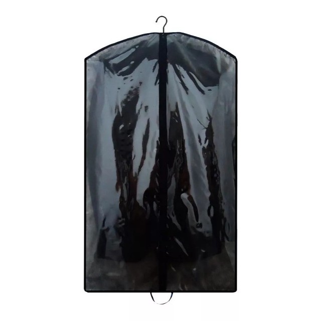 Capa para Terno em TNT com Visor em PVC Parte de trás em TNT; Parte frontal em PVC Transparente; Zíper frontal; Medidas: 97 x 60 cm *Cabide não incluso Soberano Capas