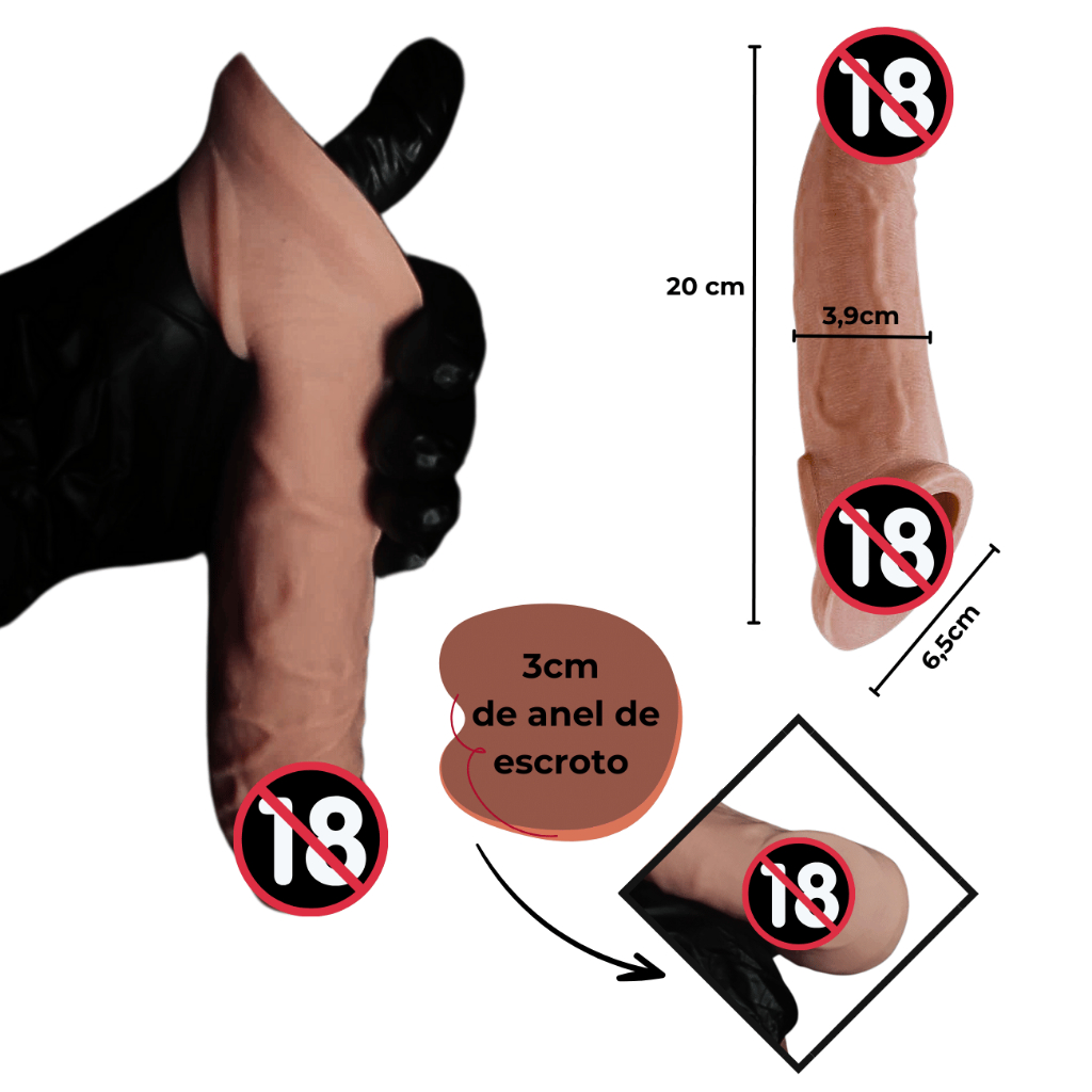 REALIZE O SEU SONHO E TENHE O PAU QUE NUNCA TEVE! CAPAZ DE TORNAR A RELACAO MAIS PRAZEROSA! Quem nunca teve um problema com pau pequeno, que atire a primeira pedra! A gente sabe que e normal, mas faz com que nao aproveitemos tudo aquilo que gostariamos de aproveitar ne? Com este simples item, voce consegue resolver esse problema de vez! Este incrivel item pode extender o seu pau e te permitir ter incriveis experiencias com seu(ua) parceiro(a)! Aumente a sua autoestima , deixe seu(ua) parceiro(a) com os olhos revirados e cause uma boa impressao. Ou seja, P-E-R-F-E-I-T-O! ? Possui anel para escroto que nao permite que a capa escorregue, detalhes de glande e textura de veias por todo o corpo e ainda possui preenchimento. Voce proporcionara tanto prazer ao seu amor com essa capa que trara orgasmos impressionantes e potentes! Alem de tudo isso, causa ainda mais poder na penetracao com sua(eu) parceira(o)! Porque comprar esta capa - Feito com silicone cirurgico, garantindo total conforto, elasticidade e o melhor, durabilidade; - Ideal para extensao peniana; - Possui anel escrotal, impedindo que a capa escorregue; - Aumenta o VIGOR masculino; - Aumenta o tamanho do seu penis, trazendo sensacoes unicas ao(a) companheiro(a); - Aumente o sua autoestima. Material: Silicone cirurgico, SERVE PARA QUALQUER PENIS. Medidas: Capa Peniana com Anel Escrotal -? ?20cm de comprimento e 4,5cm de espessura Itens que acompanham o pedido: - 1 unidade Capa Peniana extensor peniano. Embalagem: - Trabalhamos com total discricao sobre todos os itens que vendemos, sabemos que ninguem precisa saber do que se trata ne? Nossa intimidade so diz respeito a nos e por isso, enviamos com sacos inviolaveis e caixas, sem qualquer mencao sob o produto, nem formato, inclusive na declaracao de conteudo do item, vai escrito como creme corporal, pode comprar sem medo! Sobre a Hot Abuse Ha mais de 20 anos de mercado, trazendo o melhor do sex shop no conforto da sua casa! Itens no preco de atacado, para conseguirmos atender a todos! Sabemos que por muito tempo o sexo foi um assunto de muito tabu, mas a gente nao precisa mais viver isso ne? Se experimente, viva e sinta o melhor que temos nessa vida! Quaisquer outras duvidas, entre em contato conosco, sera um prazer te atender! Com carinho, Equipe Hot Abuse.