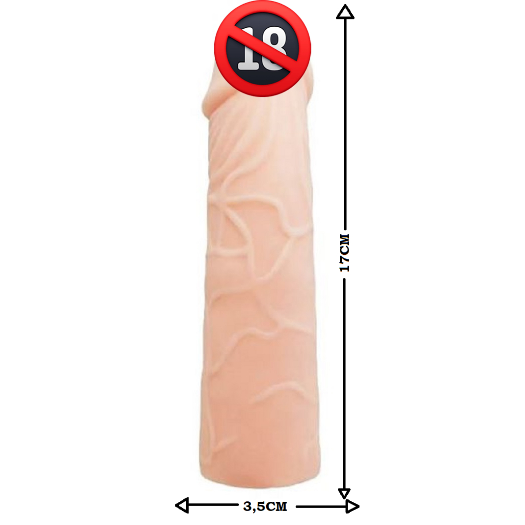 ENVIO DISCRETO Capa peniana feita em material resistente e bastante elástica, adere com perfeição em qualquer tamanho da parte íntima . Produto mede aproximadamente 17 X 3,9cm, sendo pe.netrável 11cm. Parte sólida 6cm Material: TPR não tóxico, cyberskin resistente a água. Mantenha o produto sempre seco e limpo após o uso. Mantenha fora do alcance de crianças. Uso adulto. Antes e após o uso lave com água fria e sabão neutro ou bactericida, seque com papel toalha ou deixe secar naturalmente. Não compartilhe e utilize sempre lubrificante a base de água.