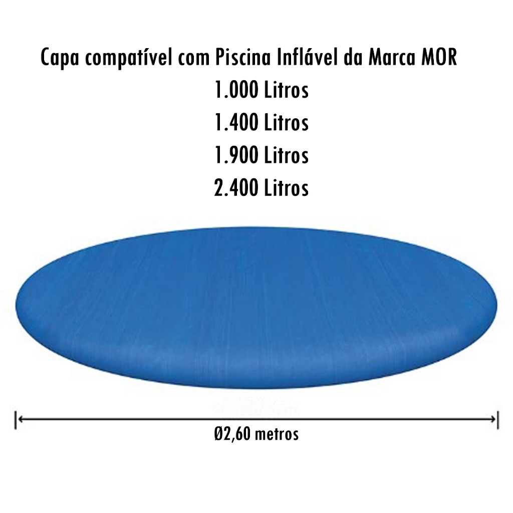 CONTEÚDO DA EMBALAGEM 01 Capa para Piscina Circular SERVE NAS PISCINAS MOR 1000 Litros - 1400 Litros - 1900 Litros e 2400 Litros Obs.: Compatível com modelos que possui a mesma circunferência circular. Possui cordas para fixação. Ajustável nas medidas de Piscina Inflável Ø 1,65 Metros de circunferência. Imagens ilustrativas, não acompanha piscina. DESCRIÇÃO DO PRODUTO Mantenha sua piscina sempre limpa com a Capa Piscina Inflável. Ela é perfeita para proteger contra insetos parasitas, água da chuva, folhas e sujeiras em geral, conservando a água da piscina própria para banho por muito mais tempo, ajudando assim o meio ambiente. Produzida em polietileno, a Capa possui cordas em poliéster para serem fixadas na estrutura da Piscina. Lembrando que, além da Capa, é indispensável fazer o tratamento químico recomendado para a capacidade de água da sua piscina de acordo com seu Manual.