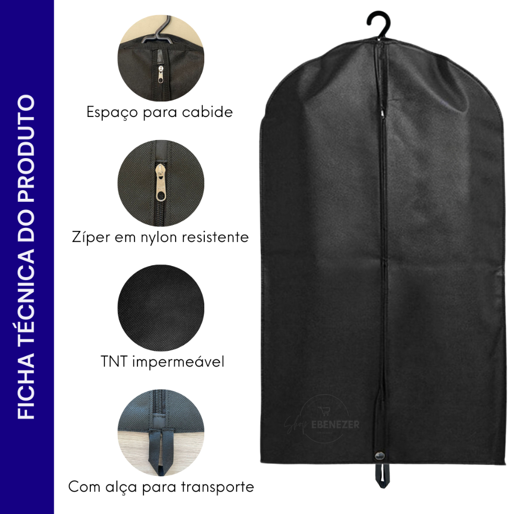 Mantenha suas roupas Preferidas Protegidas! Nossa Capa é Confeccionada com material de ótima qualidade, a prova d'agua evitando a umidade que produz o mofo e a proliferação de bactérias e ao mesmo tempo protege da poeira mantendo sempre a boa qualidade dos tecidos. Confeccionado com TNT gr 0,60, Zíper de Nylon e Cursor Niquelado. Possui Zíper em toda a altura facilitando a colocação dentro da capa. >> ESPECIFICAÇÕES CAPA TODA TNT: - Confeccionado em TNT, Zíper de Nylon e Cursor Niquelado. - Possui Zíper em toda a altura, facilitando a colocação dentro da capa. - Dimensões Capa Protetora Terno: 60cm de Largura x 100cm de Altura - Dimensões Capa Protetora Vestido: 60cm de Largura x 140cm de Altura - Dimensões Capa Protetora Vestido: 64cm de Largura x 180cm de Altura - Tecido impermeável protege da umidade, bolor e bactérias. - Ideal para Uso Doméstico, Lavanderias e Loja de Locação de Ternos. >> ESPECIFICAÇÕES CAPA COM VISOR: - Confeccionado em TNT, Zíper de Nylon e Cursor Niquelado. - Possui Zíper em toda a altura, facilitando a colocação dentro da capa. - Dimensões Capa Protetora Terno: 60cm de Largura x 100cm de Altura / Visor Lateral: 30cm de Largura x 100cm de Altura. - Dimensões Capa Protetora Vestido: 60cm de Largura x 140cm de Altura / Visor Lateral: 30cm de Largura x 140cm de Altura. - Dimensões Capa Protetora Vestido: 64cm de Largura x 180cm de Altura / Visor Lateral: 32cm de Largura x 140cm de Altura. - Tecido impermeável protege da umidade, bolor e bactérias. - Ideal para Uso Doméstico, Lavanderias e Loja de Locação de Ternos.