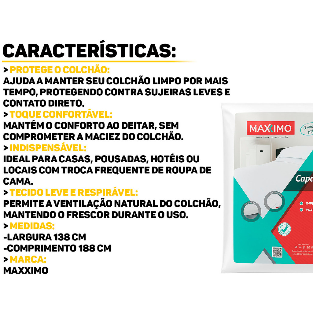 Capa para Colchão Casal Impermeável Máxximo A Capa para Colchão Máxximo foi confeccionada com materiais de alta qualidade, oferecendo conforto, praticidade e proteção contra sujeira, suor e poeira. Seu ajuste perfeito ao colchão garante firmeza e facilidade na hora de colocar e retirar. Ideal para quem busca mais higiene e durabilidade para o colchão. Características: > Impermeável; > Toque macio; > Com elástico; > Proteção antiácaro; > Design clean, combinando com qualquer roupa de cama; > Desenvolvida para proporcionar maciez, higiene e durabilidade. Especificações Técnicas: > Dimensões do produto (C x L): 1,88m x 1,38m; > Material: 100% polipropileno e forro em 100% polietileno. - Marca: Máxximo - Garantia: 90 dias contra defeitos de fabricação Vantagens de comprar na Brester: - Produto a pronta entrega. - Produto novo, com garantia de fábrica. - Nota fiscal para Pessoa Física e Pessoa Jurídica.