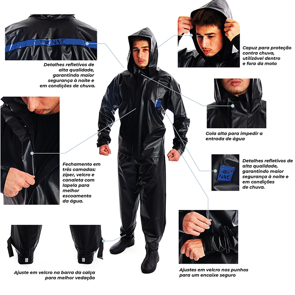 Acompanha: x1 Jaqueta x1 Calça x1 Embalagem OBS: modelagem ampla, não compre um tamanho maior que o seu! Nave prazer em proteger, na chuva se proteja com muito estilo e conforto! Foi desenvolvido com tecnologia para lhe proporcionar alta performance em qualquer situação, visando atender as pessoas que buscam o melhor equipamento sem abrir mão do visual e do conforto sobre sua moto! JAQUETA e CALÇA feito em PVC, material resistente e impermeável! JAQUETA com cintura mais comprida para maior proteção a entrada de água; gola alta; fechamento com zíper, fecho de contato e mais uma vista interno para total vedação; ajuste com fecho de contato nas mangas para evitar entrada de água; logotipos da marca Nave e material refletivo para sua maior segurança noturna! CALÇA com cintura alta para maior proteção; elástico na cintura para facilitar o uso sobre a roupa; ajuste na barra. Embalagem especial! Fácil transporte ocupando pouco volume, facilitando seu armazenamento e possibilitando levá-la em uma mochila ou em um pequeno compartimento na moto! Alguém um dia disse: "O gosto amargo da má qualidade continua muito tempo após a doçura do preço baixo que é esquecido".