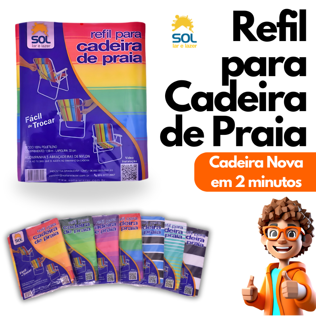 Transforme sua experiência na praia com o nosso Refil para Cadeira de Praia da Essencial Trends! Feito de tecido 100% polietileno, este refil regulável se ajusta perfeitamente ao tamanho da sua cadeira, garantindo conforto e praticidade. Instalar é super fácil e rápido: leva menos de 2 minutos! Com dimensões de 33 cm de largura e 1,59 m de comprimento, ele se adapta com facilidade. O refil acompanha 5 abraçadeiras de nylon, já presas ao tecido, para uma fixação segura. Além de ser fácil de trocar, nosso refil suporta até 120 kg, garantindo a durabilidade que você precisa. Disponível em cores sortidas, é a solução ideal para dar nova vida à sua cadeira, sem precisar se desfazer dela. Reaproveite com estilo e conforto! O Kit compõe de 1 Refil e 5 presilhas para fixação. TAGS: Refil para Cadeira de Praia Tecido de Reposição Cadeira Praia Refil Ajustável para Cadeiras Manutenção de Cadeiras de Praia Troca Fácil de Tecido Cadeira Refil Durável 120kg Cadeiras Abraçadeiras Nylon Fixação Cadeira de Praia Reformada Tecido 100% Polietileno Reforçado Solução Prática para Cadeiras