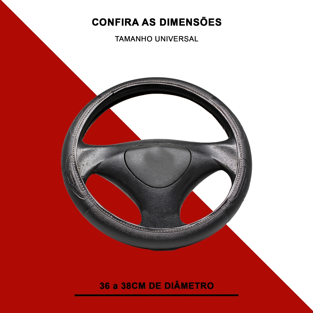 Conteúdo da Embalagem: - 1 Capa de Volante Dimensão do Produto: - 36 a 38cm de diâmetro Precauções da Capa de Volante: - Não deixar exposto a luz do Sol - Lavar com Água e sabão neutro - Não dobrar nem amassar - Secagem por gotejamento