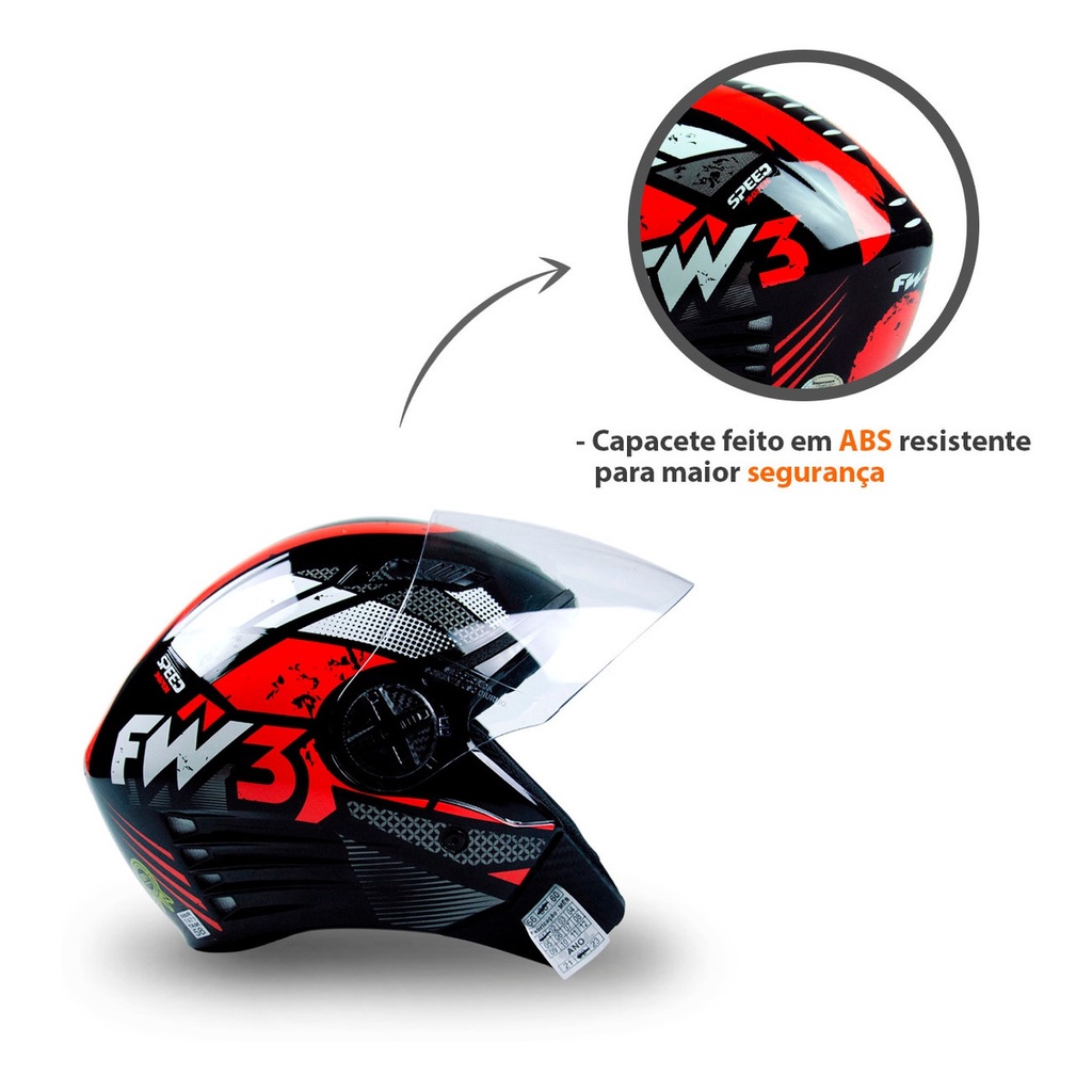 # Auto Equip # Bem-Vindo! Descrição Capacete Aberto X OPEN SPEED Vermelho e Preto - FW3: Com design esportivo e diferenciado, o capacete FW3 é perfeito para todo motociclista. Leve, estiloso e confortável, este moderno capacete vem com entrada e saída de ar, é fabricado em ABS super resistente e possui certificado de segurança. O melhor para você motociclista andar por aí com muita segurança, conforto e estilo! Características: - Modelo: X OPEN SPEED - Cor: Vermelho e Preto - Tamanho: 58 - Casco em ABS Resistente - Abertura em 5 Estágios - Viseira Transparente em Policarbonato 2.0 mm - Forro Removível - Com Entrada e Saída de Ar - Peso: 1,180 kg - Produto Certificado pelo INMETRO Conteúdo da Embalagem: - 01 Capacete Importante: Garantia de 12 meses. Pedidos aprovados até 12h00 de segunda a sexta será enviado no mesmo dia Enviamos em até 24h úteis Utilize o campo de “Perguntas e respostas” e esclareça suas dúvidas com nosso suporte técnico. A Auto Equip recomenda que a instalação seja feita por profissional especializado e não se responsabiliza pelo mau uso do produto.