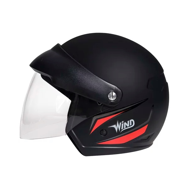 Capacete aberto preto fosco, com detalhes em vermelho e viseira acoplada. Para quem busca um capacete leve, confortável e prático. Informações Técnicas: - Selo de aprovação NBR7471 do Inmetro; - Casco injetado em ABS natural; - Grafismo em adesivo; - Engate rápido micrométrico; - Viseira cristal (transparente) acoplada; - Leve e confortável. Acerte no Tamanho! Para escolher o tamanho ideal do seu capacete utilize uma fita métrica para medir a circunferência da cabeça, passando na horizontal um dedo acima da sobrancelha e acima das orelhas, a fita métrica deve estar confortável na cabeça, sem apertar demais. É importante escolher um capacete bem justo, pois a tendência é que ele se alargue com o uso. Portanto, se a sua medida, por exemplo, é 56 ou 57 cm, escolha um 56 sem medo. A sensação de desconforto no início é normal, mas logo ele tomará a forma da sua cabeça e ficará mais confortável.