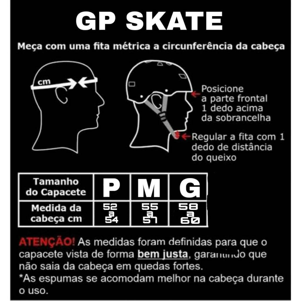 Capacete Para Skate Bike Patins Patinete Adulto P M ou G Produto Brasileiro , fortalecendo a indústria do nosso País TAMANHO P - CIRCUNFERÊNCIA DO CRÂNIO DE 53CM A 55CM TAMANHO M - CIRCUNFERÊNCIA DE 56CM A 57CM TAMANHO G - CIRCUNFERÊNCIA DE 58CM A 60CM Características Projetado para uso com skates , rollers, bicicletas e Patinete Modelo para uso adulto. Produzido em ABS de altíssima qualidade, resistente a forte impactos e colisões. Estofamento interno em espuma confortável que ajuda absorver impacto. Entradas de ar que evitam super aquecimento. Forro removível para higienização. Abertura por Fivela