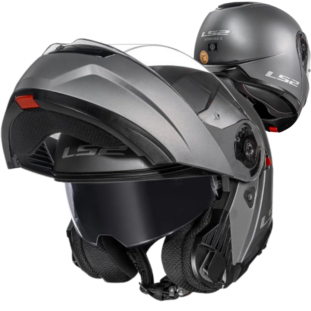 CAPACETE LS2 STROBE II FF908 CAPACETE ACOMPANHA CAIXA COM NOTA FISCAL, BOLSA DO CAPACETE E MANUAL. ====ENVIO RÁPIDO==== O Strobe II é um capacete articulado 90° multiuso ideal para uso na cidade e viagens curtas. Aprovado na mais rigorosa norma europeia ECE 22.06. Construído em KPA, um polímero exclusivo da LS2 que proporciona ainda mais segurança e resistência. A viseira conta com amplo campo de visão, é resistente a risco e preparado para Pinlock®. O sistema de ventilação foi aprimorado. O forro interno é respirável, antibacteriano e removível para lavagem. Apresenta pré-disposição para instalação de intercomunicador. Características: -Casco em KPA, com alta capacidade de absorção de impactos -Dupla homologação europeia ECE 22.06, para uso aberto e fechado; -Fecho micrométrico; -EPS canaletado de múltipla densidade; -Alça de queixo reforçada; -Múltiplas entradas e saídas de ar para maior conforto térmico; -Espuma cortada a laser; -Forração hipoalergênica, removível, lavável e super confortável; -Preparado para intercomunicador LS2/Cardo; -Viseira resistente a riscos e com proteção UV; -Preparado para Pinlock 70; -Conta com sistema rápido e eficiente de troca de viseira.