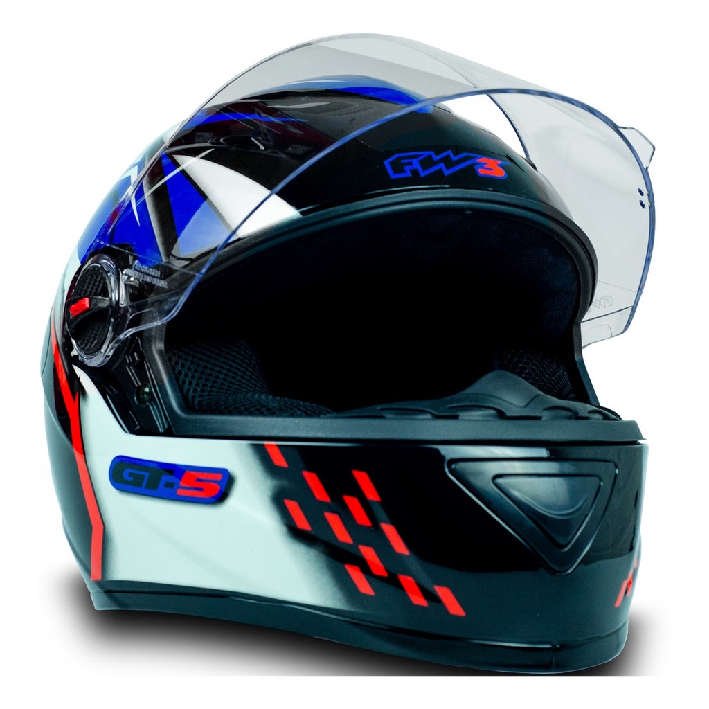 # Auto Equip # Bem-Vindo! * Produtos de Qualidade * Postagens até 24h * Pagamento Facilitado Descrição Capacete Fechado GT5 Preto com Azul, Vermelho e Branco - FW3: Com design esportivo e diferenciado, o capacete FW3 é perfeito para todo motociclista. Leve, estiloso e confortável, este moderno capacete vem com entrada e saída de ar, é fabricado em ABS super resistente e possui certificado de segurança. O melhor para você motociclista andar por aí com muita segurança, conforto e estilo! Características: - Modelo: GT5 - Cor: Preto com Azul, Vermelho e Branco - Tamanho: 60 - Casco em ABS Resistente - Abertura em 2 Estágios - Viseira Transparente em Policarbonato 2.5 mm - Forro Removível - Forração com Espuma de Densidade D28 - Fitas autocolantes internas para Fixar a Bochecheira ao Casco - Com Entrada e Saída de Ar - Com Narigueira - Peso: 1,180 kg - Produto Certificado pelo INMETRO Conteúdo da Embalagem: - 01 Capacete Importante: Garantia de 12 meses. A Auto Equip recomenda que a instalação seja feita por profissional especializado e não se responsabiliza pelo mau uso do produto. - Somente dê o lance se realmente tiver a intenção de comprar. - Utilize o espaço reservado para perguntas e esclareça suas dúvidas. - Nosso primeiro contato será via e-mail. Certifique-se de que seu e-mail cadastrado está correto. - Clique em comprar apenas uma vez e aguarde alguns minutos até receber um e-mail de confirmação do pedido. - Para ter a certeza que seu pedido foi confirmado, acesse sua área restrita e vá em MINHAS COMPRAS, e verá seu pedido. - Não clique em comprar mais de uma vez em hipótese nenhuma, pois gera transtornos para nossa empresa e para você! - Confira sua mercadoria ao receber. *A postagem será feita em 24 horas úteis.