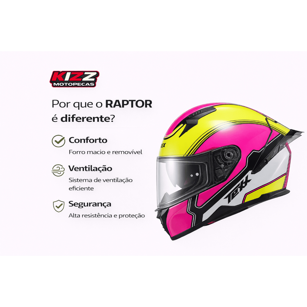 CAPACETE TEXX FECHA RAPTOR SOLID PRET FOSC 56 A blindagem que sua mente precisa tem nome: RAPTOR. ⭐ Avaliado com 5.0 por motociclistas que elogiam conforto, encaixe e ventilação ✔ Ideal para uso urbano e estrada ✔ Preparado para intercomunicador O spoiler removível e o casco com design impactante despertam suas habilidades da forma mais intensa possível TEXX RAPTOR projetado para dominar cada canto da cidade. DETALHAMENTO Capacete fechado; CONSTRUÇÃO • Casco produzido em ABS; • Casco interno produzido em EPS; • Viseira produzida em policarbonato de 2.2 mm com tratamento antirrisco e antiembaçamento; TECNOLOGIA • Sistema de circulação de ar AIRTEXX.entradas de ar frontais e superiores para melhor circulação durante o uso; • Dutos de ar que dão acesso diretamente na viseira quando aberta a entrada de ar frontal; • Forro interno com acabamento MFI removível produzido em Microfibra Inteligente TEXX que é capaz de evaporar suor e umidade rapidamente além de possuir tratamento anti-bactéria e anti-alérgico; • Sistema troca rápido viseira; CONFORTO • Desenho do forro anatômico; • Bochecheiras removíveis proporcionando melhor conforto; DESIGN • Bavete removível; • Contém narigueira removível; • Fixador de viseira garantindo um melhor isolamento acústico; • Casco aerodinâmico com design moderno; • Espaço interno e externo para inserção do intercomunicador; AJUSTES • Cinta jugular em engate micrometric; CERTIFICAÇÃO • Certificado pelo Inmetro e 22.06 ECE (normativa europeia)