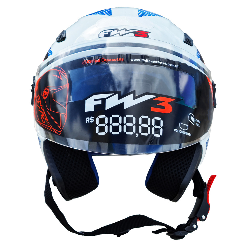 Bem-vindo(a) a AT4U! CAPACETE FW3 MODELO X OPEN USA BRANCO BRILHANTE Maior conforto e segurança no seu andar! Com design esportivo e diferenciado, o capacete FW3 é perfeito para todos os motociclistas. Leve, estiloso e confortável, este moderno capacete vem com entrada e saída de ar, é fabricado em ABS super resistente e possui certificado de segurança. O melhor para você motociclista andar por aí com muita segurança, conforto e estilo! Capacetes da FW3 são projetados para lhe oferecer uma experiência inesquecível em cada um dos seus trajetos. Seus capacetes possuem uma estrutura compacta que se adapta perfeitamente ao condutor, preservando ao máximo sua segurança e garantindo trajetos confortáveis e divertidos. **ANTES DA COMPRA SELECIONAR O TAMANHO DESEJADO** Tamanhos Disponíveis: - Tamanho 56 (55 ou 56 cm de circunferência da cabeça, Pequeno (S)); - Tamanho 58 (57 ou 58 cm de circunferência da cabeça, Médio (M)); - Tamanho 60 (59 ou 60 cm de circunferência da cabeça, Grande (L)). Especificações Técnicas: - Modelo: X OPEN USA BRANCO BRILHANTE; - Cor: Branco brilhante, branco, azul e vermelho; - Casco em ABS; - Viseira Transparente de Policarbonato 2,0mm Podendo ser Removida; - Forração em Camurça Jet Black 6 mm (Removível); - Entrada e Saída de Ar no Casco; - Reparo com Trava de Viseira; - Selo Inmetro. Conteúdo da Embalagem: - 01 Capacete FW3 Modelo X OPEN USA BRANCO BRILHANTE. IMPORTANTE: *Postagem em até 24h.* *Entrega Garantida.* *Produtos Originais e Certificados.* *COMPRE COM SEGURANÇA.* *Tire suas dúvidas via chat com nossos especialistas.*