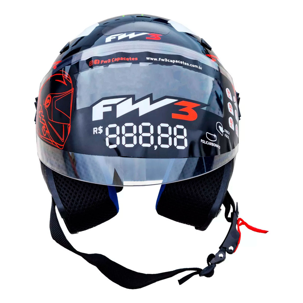 # Auto Equip # Seja bem-vindo(a)!!! --- Descrição Capacete Moto FW3 X Open Up 43 Com design esportivo e diferenciado, o capacete FW3 é perfeito para todos os motociclistas. Leve, estiloso e confortável, este moderno capacete vem com entrada e saída de ar, é fabricado em ABS super resistente e possui certificado de segurança. O melhor para você motociclista andar por aí com muita segurança, conforto e estilo! Capacetes da FW3 são projetados para lhe oferecer uma experiência inesquecível em cada um dos seus trajetos. Seus capacetes possuem uma estrutura compacta que se adapta perfeitamente ao condutor, preservando ao máximo sua segurança e garantindo trajetos confortáveis e divertidos. Especificações Técnicas: - Modelo: X OPEN UP 43; - Casco em ABS; - Viseira Transparente de Policarbonato 2,0mm Podendo ser Removida; - Forração em Camurça Jet Black 6 mm (Removível); - Entrada e Saída de Ar no Casco; - Reparo com Trava de Viseira; - Selo Inmetro; - Óculos Interno Fumê contra Raios UV. * ESCOLHA/VERIFIQUE O TAMANHO ANTES DE EFETUAR O PAGAMENTO ** VERIFIQUE A CIRCUNFERÊNCIA DA CABEÇA ANTES DE EFETUAR A COMPRA Conteúdo da Embalagem: - 01 Capacete FW3 Modelo X OPEN UP 43 c/ Óculos Interno Fumê Importante - Garantia de 03 meses; - Pedidos aprovados até 12h00 de segunda a sexta será enviada no mesmo dia; - Enviamos em até 24h úteis; - Utilize o campo de "Perguntas e respostas" e esclareça suas dúvidas com nosso suporte técnico.