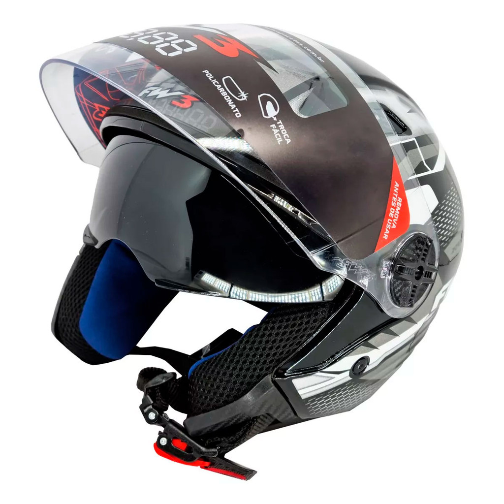 # Auto Equip # Seja bem-vindo(a)!!! --- Descrição Capacete Moto FW3 X Open Up Fox Com forração de camurça aveludada removível, cinta rebitada no casco, bochecha de camurça aveludada não removível e saída de ar, este capacete para moto faz sucesso em todo Brasil. Conta ainda com a viseira mais resistente do mercado, injetada com policarbonato 2mm, e a bochecha tem orelha injetada e arrebitada no casco, altamente resistente. Rigidez e segurança fazem parte do X Open Fox, que cobre desde o queixo até a nuca. A FW3 Capacetes tem uma variedade de modelos exclusivos. Conte com troca facilitada de acessórios e peças da própria FW3! Especificações Técnicas: - Disponível em tamanhos: 56, 58 e 60 (Verificar disponibilidade do estoque antes de efetuar a compra) - Disponível em diversas cores (Verificar disponibilidade do estoque antes de efetuar a compra) - Peso: 1,6kg - Fabricado em policarbonato, 2 mm de espessura cor preto fosco e acionamento em 2 estágios. - Forro especial com tecido tipo helanca de 6mm, cor azul Poseidon com os acabamento em tecido, cor preto e a Bavete em tecido; - Bavete em tecido furadinho; - Super confortável com espuma de D23; - Abertura da viseira com 2 estágios de regulagem; - Entrada de ar Frontal; - Bochecheiras; - Viseira em policarbonato cristal 2,2 mm; - Óculos interno cor fume de 2,0 mm com 2 estágios de regulagem; * ESCOLHA O TAMANHO ANTES DE EFETUAR O PAGAMENTO ** VERIFIQUE A CIRCUNFERÊNCIA DA CABEÇA ANTES DE EFETUAR A COMPRA Conteúdo da Embalagem: - 01 Capacete FW3 X OPEN UP FOX - 01 Viseira Escolhida - 01 Viseira Transparente de Brinde Importante - Garantia de 03 meses; - Pedidos aprovados até 12h00 de segunda a sexta será enviada no mesmo dia; - Enviamos em até 24h úteis; - Utilize o campo de "Perguntas e respostas" e esclareça suas dúvidas com nosso suporte técnico.