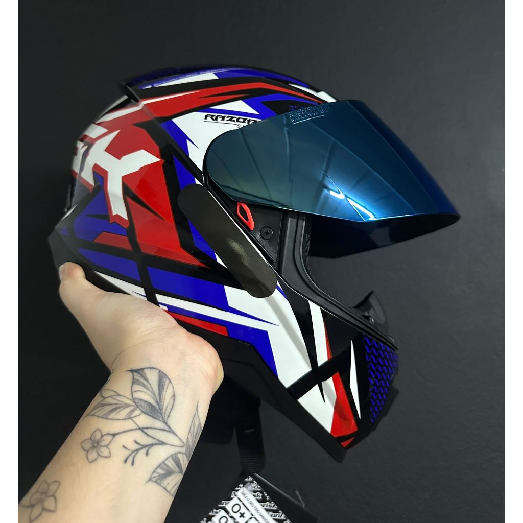 CAPACETE NORISK RAZOR SHARP AZUL VERMELHO MASCULINO FEMININO ESPORTIVO BARATO + VISEIRA + BRINDE + NARIGUEIRA + BAVETE