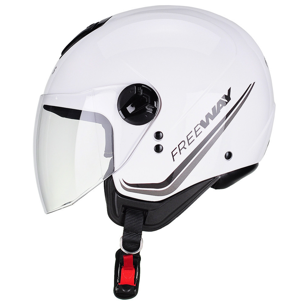 FREEWAY Liberdade e diversão O Freeway é o modelo ideal de capacete aberto para uso urbano. Para quem deseja pilotar com liberdade e praticidade nos trajetos do dia a dia, o modelo oferece um amplo campo de visão com a viseira alongada. Capacete perfeito para quem é autêntico e não abre mão do estilo. Características do produto: Gerais: - Revestimento interno removível e lavável em tecido antialérgico. - Produzido no Brasil, com disponibilidade de peças de reposição e fácil manutenção. - Peso 1200g. Visor: - Visão panorâmica. - Viseira de policarbono de 2 mm. - Viseira de troca rápida. - Viseira antirrisco. Segurança: - Fecho micrométrico de fácil manipulação. - Testes de qualidade realizados com a mais alta precisão. Ventilação: - Capacete aberto, facilitando ventilação.