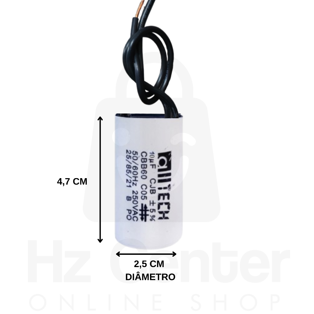 Capacitor de partida para automatizador de portão, entre outras funções. Modelo 10uF 250VAC Voltagem a ser utilizada 110v ou 220V Frequência 50/60Hz Material: Poliester Tamanho do produto: 2,5cmx4,8cm *Marca do fabricante conforme disponibilidade Trabalhamos com as marcas AllTech, Handing e HQ mandaremos de acordo com a disponibilidade do estoque. ITENS INCLUSOS : 01 CAPACITOR 10UF X 250 VAC
