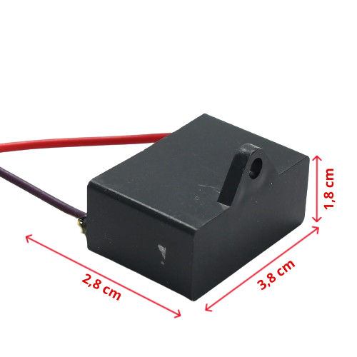 Capacitor para Ventiladores de Teto e de Piso Para Várias Marcas e Modelos. Capacitância 2,5uF Voltagem 450V Dimensões: 3,8cm Largura / 2,8cm Altura / 1,8cm Profundidade. PRODUTO FUNCIONA TANTO NOS VENTILADORES 110V COMO NOS 220V ** Verificar CAPACITÂNCIA e VOLTAGEM antes da Compra junto ao produto Original, as mesmas devem ser iguais as do anunciado. ** Especificações: - Capacitor De Partida CBB61 2,5uF 250V ( 2 Fios ) - Capacitância Total: +2,5uF - Tensão Nominal: 450V AC - Tolerância: ±5% - Frequência: 50/60Hz - Tipo de Terminal: 2 fios: - Temperatura de Operação: -25°C a 85°C - Umidade Relativa: 85% (sem condensação) - Dimensões (AxLxC): 3,8 x 1,8 x 3,8 (aproximadamente) Aplicações Típicas: Motores elétricos monofásicos Ventiladores Condicionadores de ar Outros equipamentos elétricos que requerem partida de motor