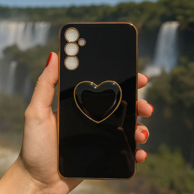 Capinha em Silicone Macio com Molduras em Dourado e Suporte De Coração - Leve - Feita com material resistente - Elegante - Durável