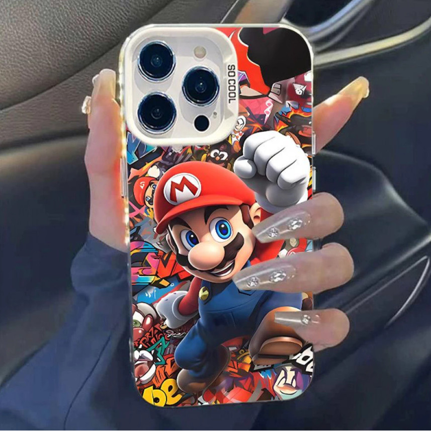 Capinha iphone 11/12/13/14/15/16 Pro max,Capa prateada colorida à prova de choque para celular, Mario,estojo proteção