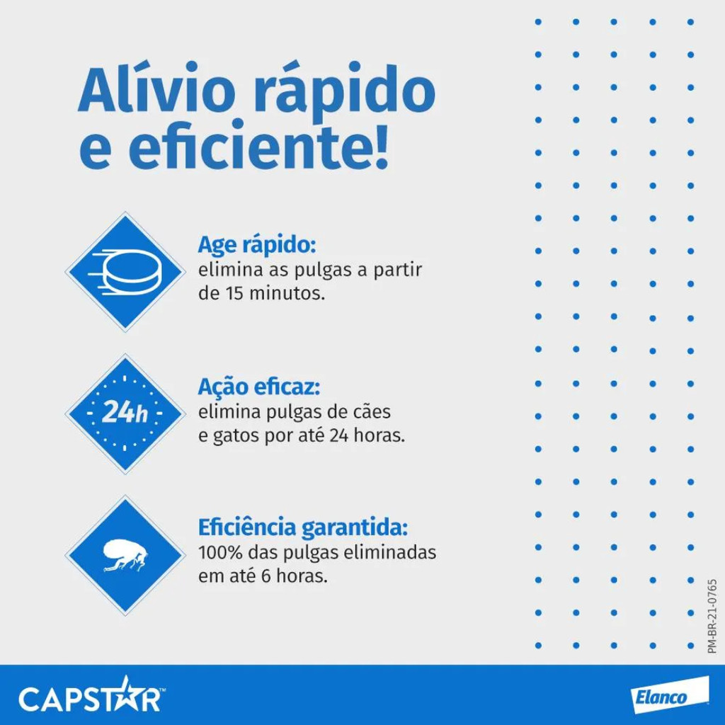 - Ação rápida contra as pulgas; - Comprimido rapidamente absorvido pelo organismo; - Administração via oral; - Indicado para cães e gatos com até 11,4 kg; - Trata miíase (bicheira) em cães; - Pode ser usado em animais a partir de 4 semanas de idade. ** PRODUTO ORIGINAL Quando nossos pets são infestados por parasitas ou bicheiras, tudo que mais queremos é realizar um tratamento de eliminação desses parasitários, pensando no bem-estar dos animais. Pensando nisso, a Elanco desenvolveu o Capstar, um antipulgas para cães e gatos. O medicamento é completo e possui rápida ação no organismo dos animais. Quer conhecer mais antes de comprá-lo? Veja a seguir em quanto tempo ele começa a agir, qual o modo de usar, quando ele não é indicado e muito mais! Para que serve o Capstar? O antipulgas Capstar serve para a eliminação das pulgas adultas em cães e gatos que pesam até 11,4 kg. O medicamento também é indicado no tratamento de miíases (bicheiras) causadas por larvas de Cochliomyia hominivorax em cãezinhos. Em quanto tempo o Capstar faz efeito? O medicamento Capstar começa a fazer efeito a partir de 15 minutos após a administração completa do comprimido. Por isso, é importante estar atento para que o pet consuma todo o remédio de modo que não interfira na ação do princípio ativo Nitenpiram. Qual é o modo de usar o Capstar? O Capstar para cachorros e gatos deve ser administrado em dose única, via oral, em pets que tenham mais de quatro semanas de vida. De acordo com a recomendação do médico-veterinário, se for necessário, o tratamento deve ser repetido após 24 horas. A administração do remédio antipulgas pode ser feita com ou sem alimento, sendo escolha do tutor optar pela forma mais prática na ingestão do pet. Se houver dúvidas, consulte um profissional indicado para ajudá-lo. Capstar: Contraindicação e cuidados A administração do antipulgas não é indicada em filhotes de cães e gatos com menos de quatro semanas de vida. A recomendação, presente na bula do Capstar, existe por falta de estudos em animais nessa faixa etária. Para fêmeas gestantes e lactantes e machos em reprodução, o uso do medicamento é seguro. Entre os cuidados após comprar o Capstar estão: guardar longe do alcance de crianças e pets; conservar o produto em local seco e arejado, ao abrigo da luz solar direta e com temperatura ambiente inferior a 25 ºC. Quantas vezes posso dar Capstar? O período de uso dependerá do nível de infestação, mas normalmente não há necessidade de aplicar mais do que uma dose. O médico-veterinário orientará o intervalo entre as administrações caso seja necessário.