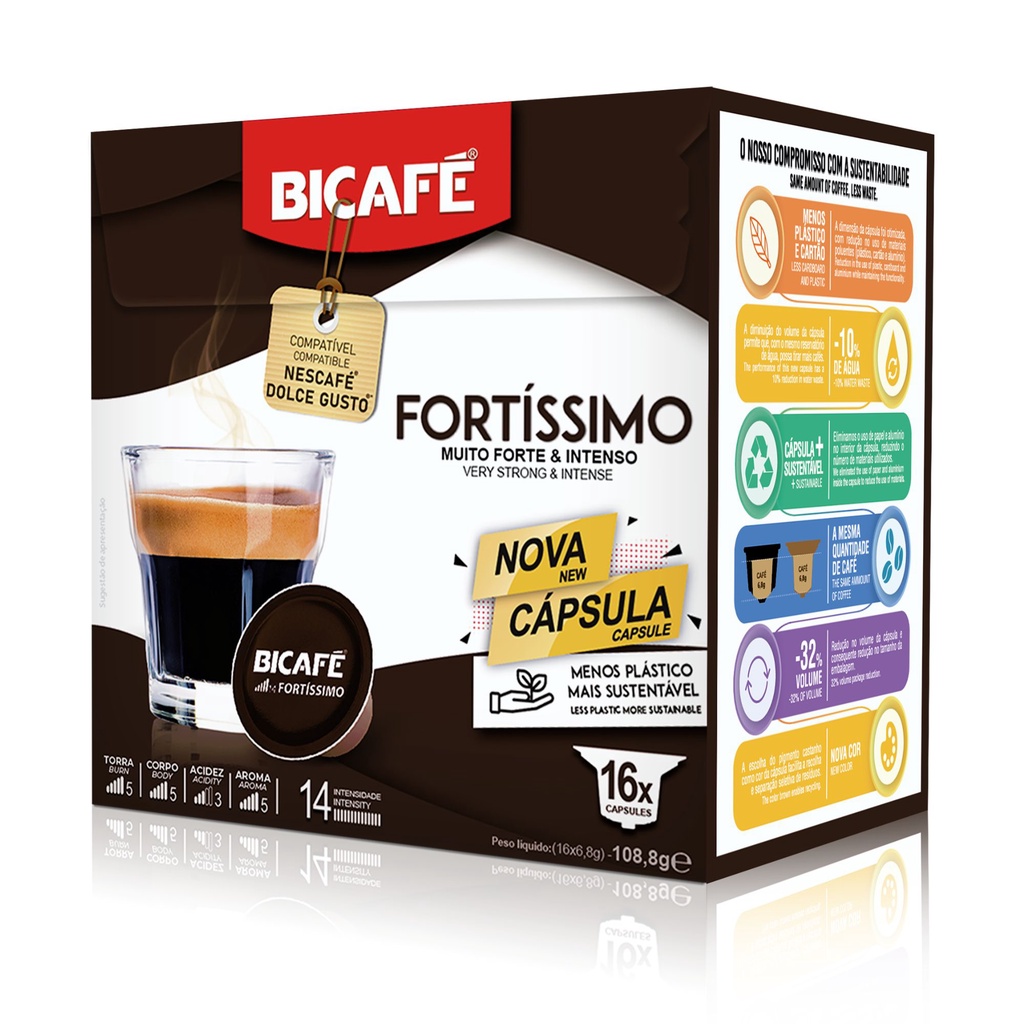 FORTÍSSIMO | Muito Forte & Intenso 16 cápsulas compatíveis com máquinas Dolce Gusto®* Intensidade 14 DESCUBRA A NOSSA NOVA CÁPSULA . A MESMA QUANTIDADE DE CAFÉ, MAIOR SUSTENTABLIDADE E TOTAL COMPATIBILIDADE. Conscientes da pegada ambiental e da problemática associada ao consumo de plástico e outros materiais, redesenhamos a nossa cápsula compatível com as máquinas Dolce Gusto*, para que possa desfrutar do seu café com a mesma qualidade de sempre, reduzindo o desperdício, para um consumo mais sustentável. Fortíssimo é um café com torra intensa. Selecionámos cuidadosamente os grãos que mais sobressaem quando submetidos a este grau de torrefação e que permitem obter um café com elevado nível de cremosidade, um corpo denso e poderoso e notas finais a chocolate negro, deliciosamente amargas. Um café poderoso e rico. Produzido em Portugal Grãos de várias origens 100% café torrado e moído 100% produzido com energia limpa Conheça a nossa linha completa de cafés e bebidas compatíveis com máquinas Dolce Gusto* Café torrado moído | Modo de preparação: Proceda de acordo com o manual de instruções da sua máquina | Conservar em local fresco e seco | Peso líquido: 108,80 g (16 x 6,8 g) *Marca pertencente a terceiro sem ligação à Bicafé