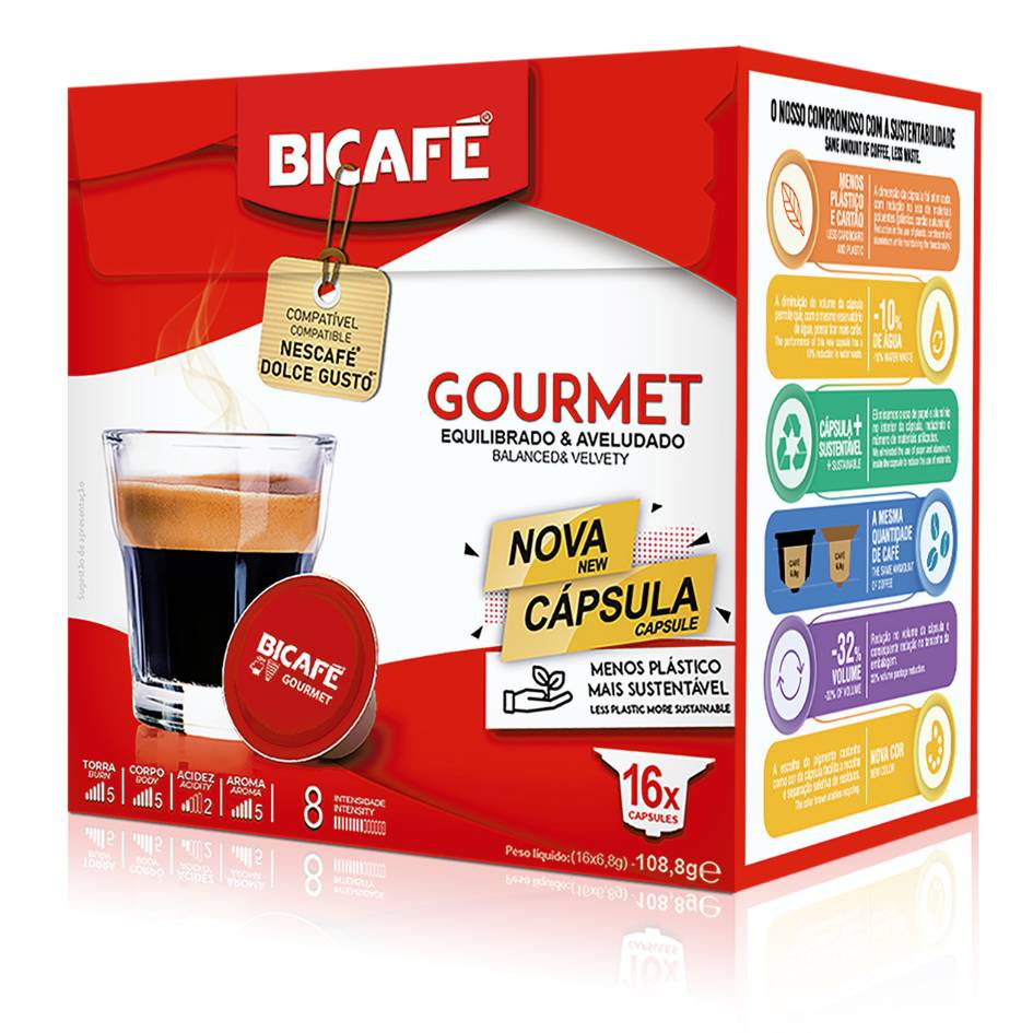 GOURMET | Equilibrado & Aveludado 16 cápsulas compatíveis com máquinas Dolce Gusto®* Intensidade 8 DESCUBRA A NOSSA NOVA CÁPSULA . A MESMA QUANTIDADE DE CAFÉ, MAIOR SUSTENTABLIDADE E TOTAL COMPATIBILIDADE. Conscientes da pegada ambiental e da problemática associada ao consumo de plástico e outros materiais, redesenhamos a nossa cápsula compatível com as máquinas Dolce Gusto*, para que possa desfrutar do seu café com a mesma qualidade de sempre, reduzindo o desperdício, para um consumo mais sustentável. Equilibra com perfeição o sabor aveludado dos melhores grãos com o creme mais denso e saboroso. Produzido em Portugal Grãos de várias origens 100% café torrado e moído 100% produzido com energia limpa Conheça a nossa linha completa de cafés e bebidas compatíveis com máquinas Dolce Gusto* Café torrado moído | Modo de preparação: Proceda de acordo com o manual de instruções da sua máquina | Conservar em local fresco e seco | Peso líquido: 108,80 g (16 x 6,8 g) *Marca pertencente a terceiro sem ligação à Bicafé