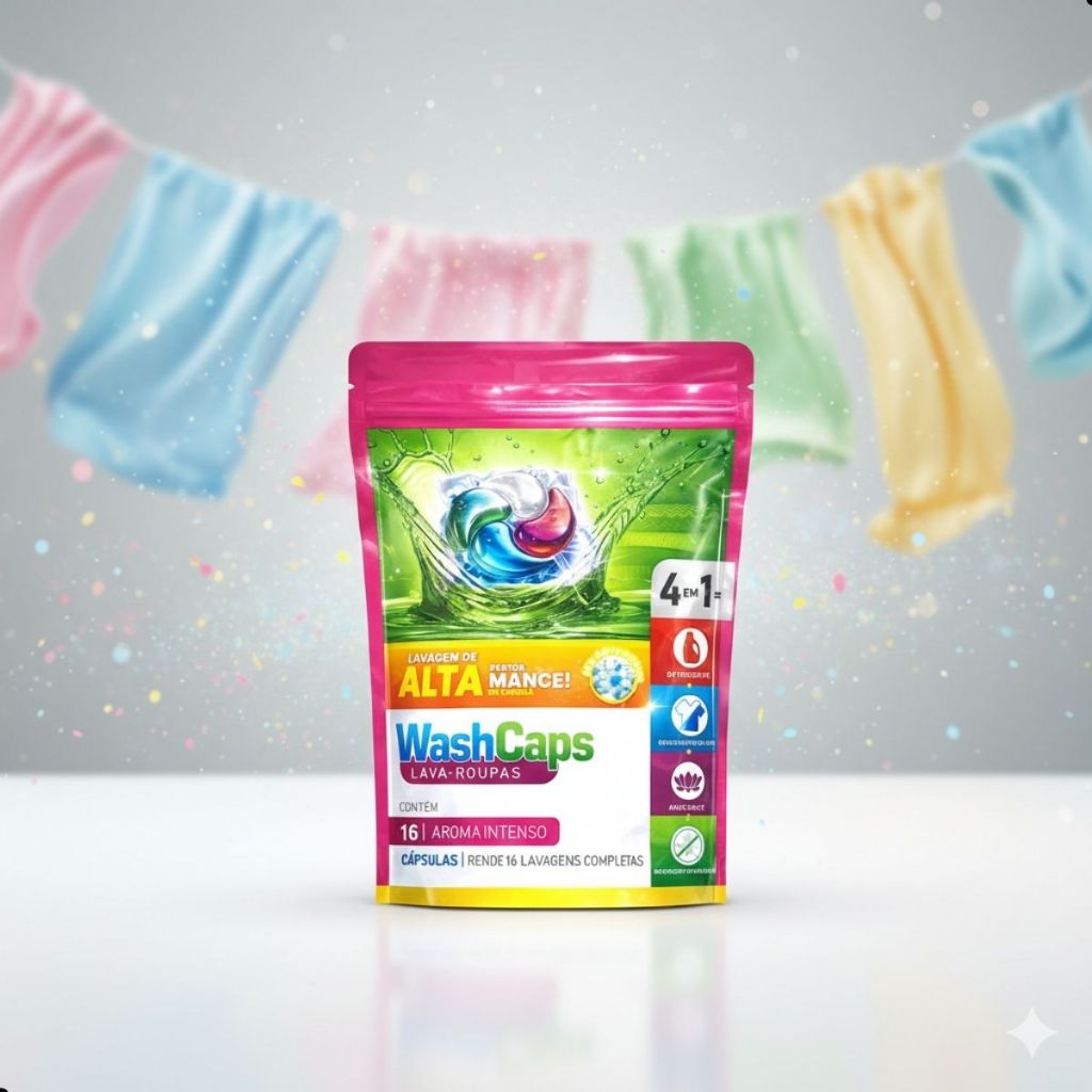 Wash Caps Lava-Roupas Alta Performance – Aroma Intenso – Cápsulas Concentradas O Wash Caps Lava-Roupas Alta Performance foi desenvolvido para oferecer limpeza profunda, praticidade e perfume intenso em cada lavagem. Suas cápsulas concentradas possuem dosagem precisa, facilitando o uso e garantindo excelente desempenho desde o primeiro ciclo. Com fórmula de alta eficiência, o Wash Caps remove sujeiras do dia a dia e manchas leves, cuidando dos tecidos e deixando as roupas limpas, macias e com aroma intenso e duradouro. Basta colocar a cápsula diretamente no tambor da máquina e iniciar a lavagem. Ideal para quem busca praticidade, economia de produto e resultado profissional, sem desperdício e sem necessidade de medir detergente. Principais benefícios: Limpeza eficiente com alta performance Aroma intenso e duradouro nas roupas Cápsulas pré-dosadas, práticas e fáceis de usar Evita desperdício de produto Dissolve completamente durante a lavagem Indicado para roupas do dia a dia Características do produto: Tipo: lava-roupas em cápsulas Fórmula: concentrada Aroma: intenso Aplicação: lavadoras automáticas Uso: colocar a cápsula diretamente no tambor Modo de uso: Coloque 1 cápsula diretamente no tambor da máquina antes de adicionar as roupas. Ajuste o ciclo conforme o nível de sujeira e a quantidade de peças. Produto ideal para quem deseja roupas limpas, perfumadas e com máximo rendimento, aliando tecnologia, praticidade e alto desempenho em cada lavagem.