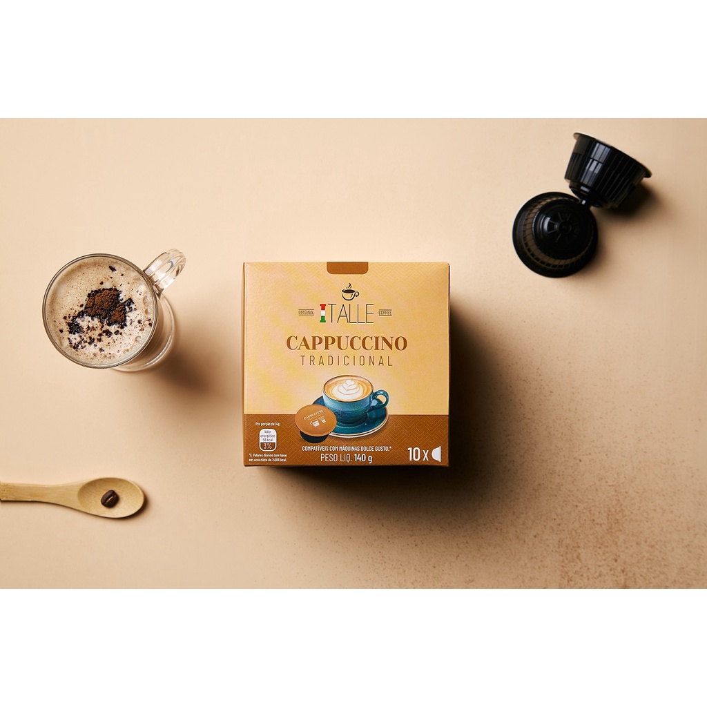 CAPSULAS PARA MAQUINA DOLCE GUSTO KIT 5 Cápsulas Cappuccino, Chocolate e Creme Brulee Chocolate Branco Dolce Gusto - Cappuccino Gourmet 10 Cápsulas - Chocolate Gourmet 10 Cápsulas - Creme Brulee 10 Cápsulas - Chocolate Branco 10 Cápsulas - Chocolate 70% Gourmet 10 Cápsulas Uma paixão de família que se profissionalizou, e hoje traz os melhores cafés de pequenos produtores brasileiros para a mesa de cada família. Com todo cuidado no processo de escolha dos grãos, colhidos de forma artesanal e processos sustentáveis a Café Italle trás o conceito italiano em cápsulas para o seu paladar. CAPPUCCINO ITALLE: O cappuccino Italle é ideal para os fãs dessa bebida que conquistou o mundo. Nossas cápsulas combinam com café, chocolate e leite da mais alta qualidade, com o toque certo de canela, proporcionando a cremosidade perfeita para qualquer momento do dia. Deixe sua bebida ainda mais gostosa adicionando chantilly e um toque de achocolatado em pó. CHOCOLATE O clássico chocolate quente, cremoso e delicioso, para envolver seu paladar. Nossa versão traz o melhor do cacau brasileiro, com leite de alta qualidade, para que você saboreie uma bebida equilibrada e surpreendente. Finalize com um pouco de chantili para potencializar ainda mais a textura. Crème Brûlèe Um das receitas mais clássicas da França direto para o seu paladar. Nosso Crème Brûlée traz a máxima cremosidade com o toque delicioso da baunilha para te surpreender. Prove também com um toque de canela em pó, para um sabor ainda mais elaborado. CHOCOLATE BRANCO O clássico chocolate branco quente, cremoso e delicioso, para envolver seu paladar. Nossa versão traz o melhor do cacau brasileiro, com leite de alta qualidade, para que você saboreie uma bebida equilibrada e surpreendente. Finalize com um pouco de chantili para potencializar ainda mais a textura.. ALÉRGICOS: CONTÉM DERIVADOS DE LEITE, SOJA, PODE CONTER AVEIA, CEVADA, OVO E TRIGO. CONTEM LACTOSE Experimente seu momento Italle!