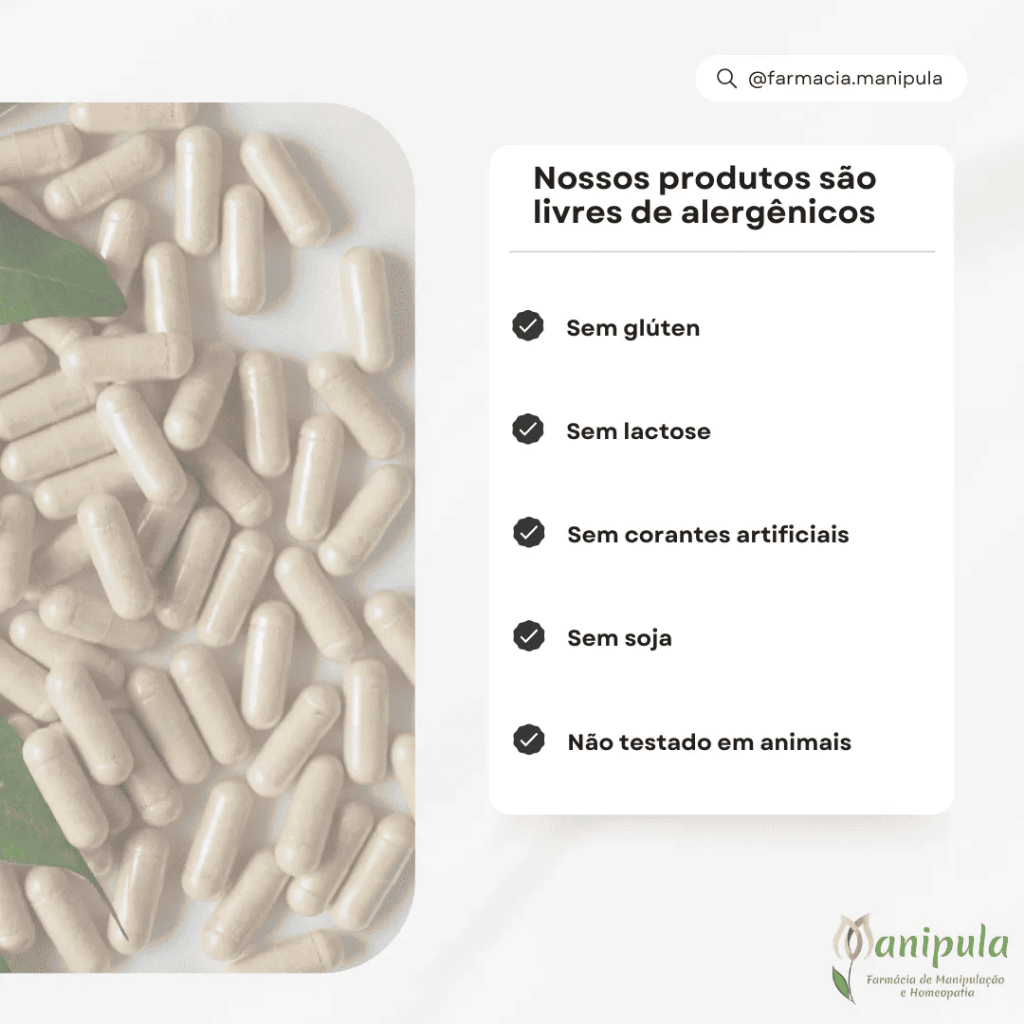 cada pote com 30 capsulas Fórmula Pura e Segura – Livre de Alérgenos! Sem glúten Sem lactose Sem corantes artificiais Sem soja Não testado em animais