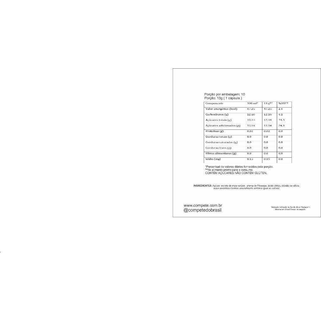 CAPSULAS COMPATIVEIS COM DOLCE GUSTO ATENÇÃO! Capsulas NÃO são compatíveis com a maquinas NEO da Dolce Gusto. Refrescância e praticidade em cápsulas Aproveite o sabor autêntico do Chá Mate com toque de Pêssego, agora na versão em cápsulas compatíveis com máquinas Dolce Gusto. Perfeito para ser consumido quente ou gelado, trazendo leveza e frescor em qualquer momento do dia. Benefícios: Compatível com máquinas Dolce Gusto* Sabor Mate Pêssego refrescante Pode ser preparado quente ou gelado Bebida pronta em segundos Conteúdo da embalagem: 1 Caixa com 10 cápsulas Peso líquido total: 130g Rendimento: 10 porções de 100 ml Modo de preparo: Coloque a cápsula na sua máquina Dolce Gusto. Ajuste o nível de água para 100 ml. Beba quente ou resfrie com gelo para uma versão gelada irresistível! Destaque da marca Capresso Capresso é sinônimo de qualidade e inovação, trazendo bebidas práticas e deliciosas para o seu dia a dia. Observação: *Produto não é fabricado nem comercializado pela Nestlé® ou Dolce Gusto®, sendo 100% compatível com as máquinas da linha Dolce Gusto. *Marca pertence a terceiros e não tem nenhum vínculo com a Compete Prime / Capresso Expresso / Compete do Brasil. Ingredientes: açúcar, extrato de mate solúvel, aroma de pêssego, acido cítrico, acido ascórbico, dióxido de silício Garanta já o seu Chá Mate Pêssego Capresso e tenha sabor e frescor em cápsulas práticas! Garantia de fábrica: 1 meses