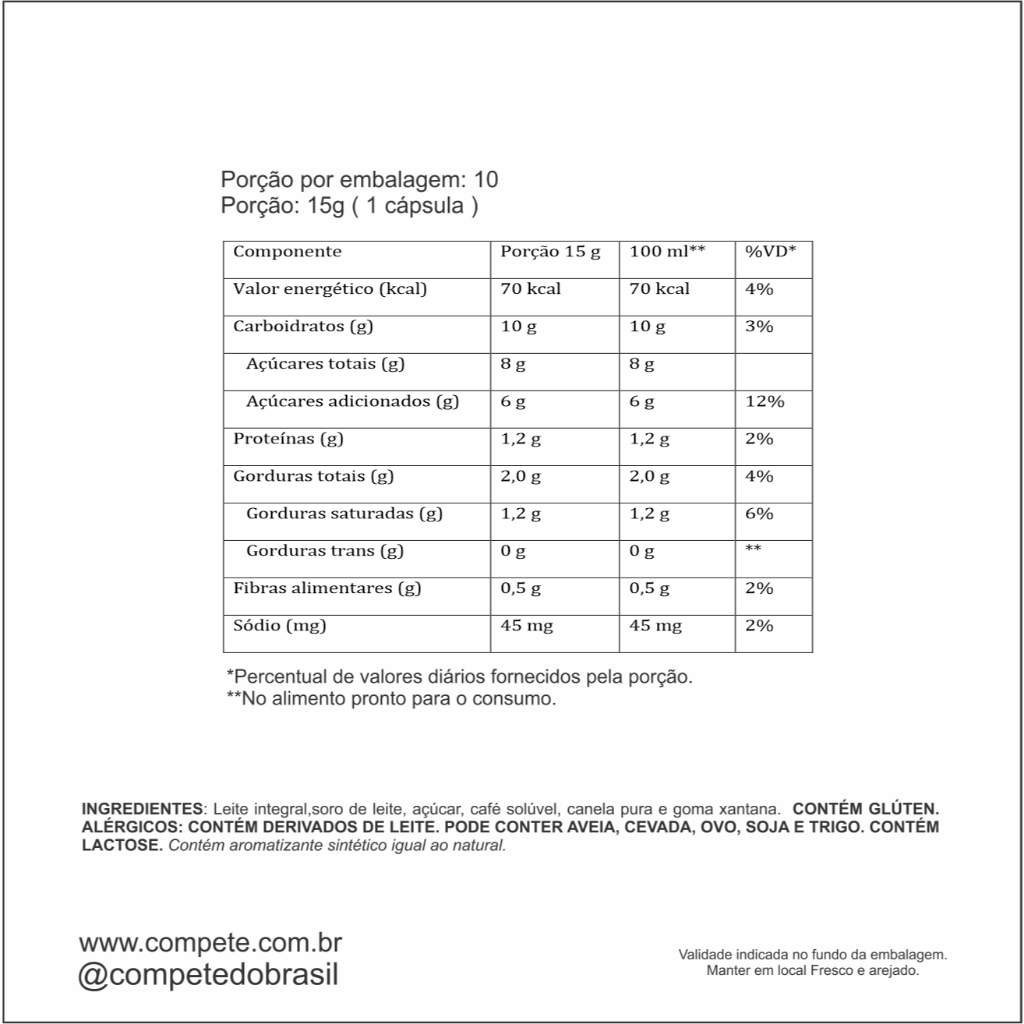 COMPATIVEIS COM MAQUINAS DOLCE GUSTO. ATENÇÃO! Capsulas NÃO são compatíveis com a maquinas NEO da Dolce Gusto. Aproveite o sabor autêntico do nosso Cappuccino Canela, agora na versão em cápsulas compatíveis com máquinas Dolce Gusto. Benefícios: Compatível com máquinas Dolce Gusto* Sabor Cappuccino Canela Bebida pronta em segundos Conteúdo da embalagem: 1 Caixa com 10 cápsulas Peso líquido total: 150g Rendimento: 10 porções de 100 ml Modo de preparo: Coloque a cápsula na sua máquina Dolce Gusto. Ajuste o nível de água para 100 ml. Ingredientes: leite integral, soro de leite, açúcar, café solúvel, canela pura e goma xantana. Capresso é sinônimo de qualidade e inovação, trazendo bebidas práticas e deliciosas para o seu dia a dia. Observação: *Produto não é fabricado nem comercializado pela Nestlé® ou Dolce Gusto®, sendo 100% compatível com as máquinas da linha Dolce Gusto. *Marca pertence a terceiros e não tem nenhum vínculo com a Compete Prime / Capresso Expresso / Compete do Brasil. Garanta já o seu Cappuccino Canela Capresso e tenha sabor em cápsulas práticas! Garantia de fábrica: 1 meses