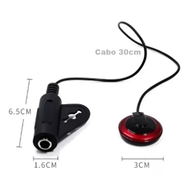 A Pronta Entrega Entrega em 24h na Região Metropolitana de São Paulo Capital. (Para compras até às 12h30 - exceto feriados e fim de semana) ------------------------------------------------------------------- Captador passivo de contato de alta qualidade e de fácil instalação. - Possui conector de saída no padrão P10. - Acompanha adesivo para fixação. - Não necessita de bateria, produto pronto para o uso. Compatível com: Violão Aço ou Nylon, Violino, Ukulele, Viola, Cavaco, Cavaquinho, Banjo etc. Detalhes técnicos: » Comprimento do cabo: 30cm » Tipo do conector de saída: P10 mono » Tipo de captador: Cápsula Cerâmica Piezoelétrica