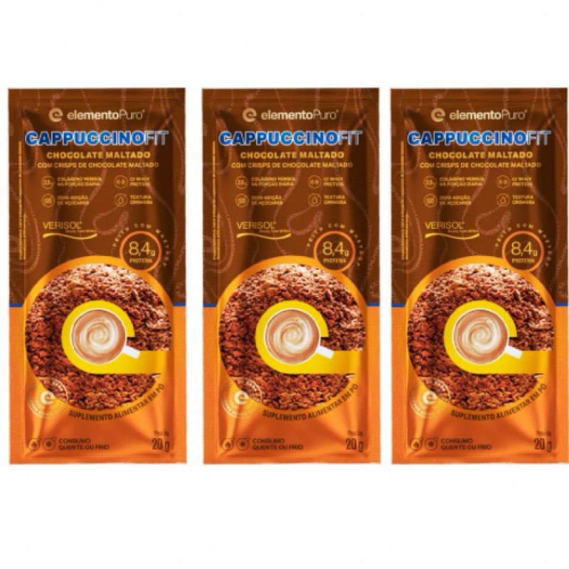 Sabe aquela vontade de um cappuccino cremoso no meio da tarde, mas sem sair da dieta? Nós passamos por isso e, depois de muito procurar e testar, encontramos a solução perfeita! Por isso, o Cappuccinofit de Chocolate Maltado da Elemento Puro entra para a nossa curadoria. Nós o escolhemos porque ele entrega uma experiência deliciosa e funcional de verdade. Com uma textura super cremosa e crisps de chocolate que dissolvem na boca, ele sacia o desejo por um doce sem peso na consciência. Cada sachê tem apenas 67 kcal, combinando 8,4g de proteína para ajudar na saciedade e na manutenção muscular, e 2,5g de Colágeno VERISOL®, um superaliado da saúde da pele, unhas e cabelos. O melhor é que ele é super versátil, podendo ser consumido quente ou frio, e não tem adição de açúcares! Nossa sugestão de receita: Para um frapuccino proteico incrível, bata um sachê no liquidificador com 150ml de leite ou bebida vegetal da sua preferência e 5 pedras de gelo. Fica uma delícia e é super refrescante para os dias mais quentes! Atenção, alérgicos: O produto CONTÉM LACTOSE, LEITE E DERIVADOS. NÃO CONTÉM GLÚTEN.