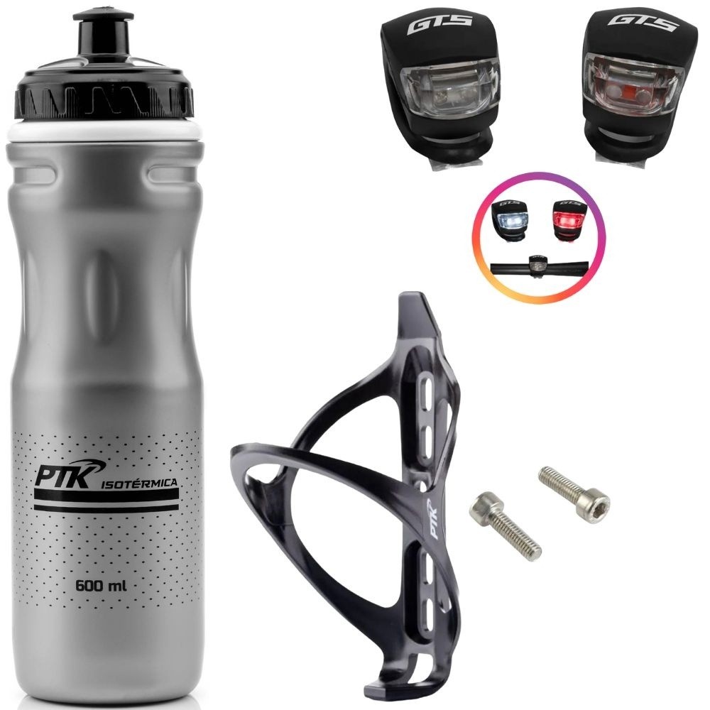 Kit Perfeito pra você que está procurando acessórios de alta qualidade e com o melhor custo beneficio do mercado para andar de bike com segurança. #O QUE VOU RECEBER NA COMPRA DESSE ANUNCIO? 01 GARRAFA ISOTÉRMICA PTK 600ML 01 SUPORTE DE NYLON PRETO SUPER RESISTENTE 01 PAR DE SINALIZADOR GTS PARA BICICLETA # DESCRIÇÃO TÉCNICA -GARRAFA -Ideal para a prática de exercícios de ciclismo, corrida, ginástica e outras atividades esportivas -Alça de segurança e construção em parede dupla -Alto desempenho de isolamento isotérmica -Flexibilidade para apertar aumentando o fluxo da água com sobre tampa exclusiva -Boca larga que facilita a limpeza e abastecimento -Marca: PTK -Material: Polipropileno -Capacidade: 600ml -Parede Isotérmica mantem a temperatura por até 3 horas -Peso: 130g -SUPORTE -Suporte em nylon super resistente e design moderno -Embalado individualmente em solapa -Fixação por parafuso INOX (acompanha par de parafuso inox) -Sistema de regulagem com duas posições -Encaixe perfeito com todas as squeezes PTK -PAR SINALIZADOR -Pisca: Um com Luz Branca (modo fixa e piscando) Um com Luz Vermelha (modo fixa e piscando) -Alimentação: 4 baterias CR2032 inclusas -Resistente á Água