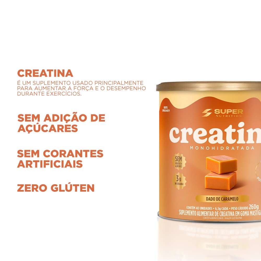 Conheça o Novo Lançamento da Super Nutrition! Creatina Monohidratada Dado de Caramelo. Sem Adição de Açúcar, Sem Glúten e Melhora o Desempenho Físico. Creatina monohidratada Suplemento que otimiza o desempenho físico, fornecendo a quantidade ideal de nutrientes para o corpo. Nova fórmula caramelo Mais saborosa e nada arenosa. Essa combinação é o prazer do sabor com os benefícios do suplemento, tornando cada mordida uma experiência tanto. Sabor delicioso Sabor inesperadamente intrigante. A doçura clássica do caramelo é misturada com um leve toque salgado, criando uma experiência gustativa única. Praticidade Fácil de incluir na sua rotina. Consuma 2 caramelos por dia, antes ou após os treinos, acompanhados de água para otimizar a absorção e manter a hidratação. Qualidade de vida Facilita exercícios e mantém força e resistência, melhorando mobilidade, metabolismo e recuperação, o que beneficia a saúde física geral. Desempenho físico A creatina aumenta a energia disponível nos músculos durante exercícios intensos e curtos.