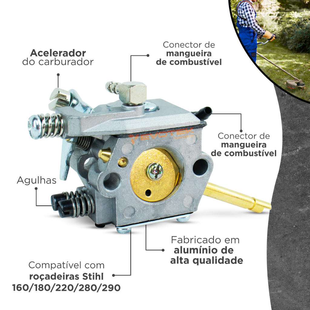 Se você está procurando por um componente essencial para garantir o funcionamento eficiente do motor da sua roçadeira, o Carburador Roçadeira Compatível Stihl FS160 FS180 FS220 FS280 FS290, é a escolha ideal. Este carburador é entregue pronto para uso, testado e ajustado para proporcionar máxima eficiência desde o primeiro momento. Com ele, você não precisa se preocupar com ajustes adicionais ou configurações complexas. Desenvolvido especialmente para roçadeiras Stihl FS160 FS180 FS220 FS280 FS290 este carburador é projetado para se encaixar perfeitamente e funcionar de forma otimizada com sua máquina. IMPORTANTE: -------------------- Antes de concluir a compra, é fundamental verificar se o modelo da sua roçadeira é compatível com este carburador. É importante ressaltar que adaptações ou modificações não autorizadas podem comprometer o desempenho da máquina e colocar em risco tanto o equipamento quanto o operador. Além disso, qualquer alteração no produto pode invalidar sua garantia. Especificações técnicas: -------------------------------- - Fabricado em Alumínio - Compatível com roçadeira Sthil 160/180/220/280/290cc Itens inclusos: ------------------- - 01 Carburador para Roçadeira Sthil 160/180/220/280/290cc