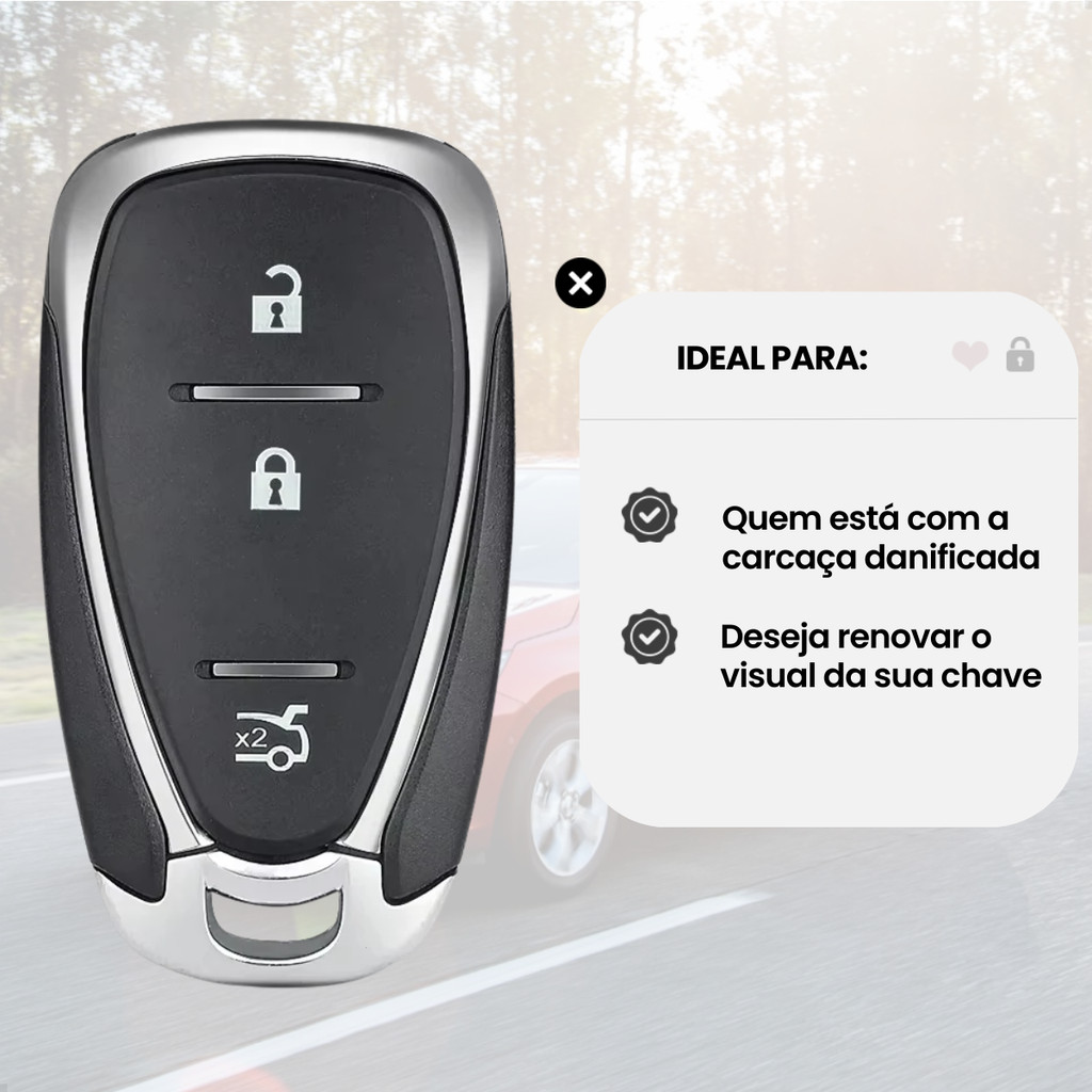 Compatível apenas com chaves modelo Keyless: • Novo Onix • Nova Tracker • Novo Cruze (Sua chave deve ser igual ao modelo ilustrado nas fotos do anúncio) • Não compatível com outros modelos de chave Especificações Técnicas: • Carcaça para Substituição • Carcaça em Plástico Resistente • Modelo com 3 Botões: Travar Portas , Destravar Portas e Porta-Malas. • Compatível somente com modelos que utilizam o Chip 4A • Não compatível com modelos que utilizam o Chip ID46 Conteúdo da Embalagem: • Carcaça da Chave Presencial; • Emblema; • Lâmina virgem ATENÇÃO: • Antes de comprar, verifique se a chave do anúncio é compatível com a sua. IMPORTANTE: • Recomendamos que a instalação seja feita por um profissional especializado. Não nos responsabilizamos pelo mau uso do produto. • NÃO COMPRE COM DÚVIDAS! Estamos à disposição no campo de perguntas e sempre prontos para responder o mais rápido possível!