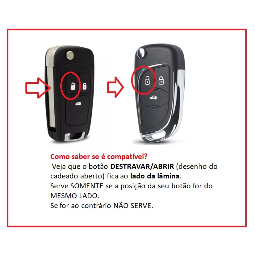 ATENÇÃO!!! NÃO acompanha Telecomando/Transponder. Podendo utilizar da sua antiga chave. Alguns modelos de alarme podem ter formato de placas diferente conforme o fabricante, portando ANTES DE COMPRAR VEJA NAS IMAGENS DO PRODUTOS (inclusive desmontado) para comparar com seu modelo atual e confirmar se sua placa é compativel. Esta carcaça chave canivete GM é recomenda para substituição da sua original, quando há desgaste, botões falhando, etc... Utilizando sempre as pecas originais antigas. CONTEÚDO: - 1 Emblema Chevrolet/GM - 1 Carcaça da Chave Canivete de 3 Botões - 1 Lâmina Virgem, (IGUAL FOTO) padrão da carcaça que já a companhas a mesma (não temos lâminas específicas por veículos). Instalação: - Retirar o telecomando e o chip da chave original para a chave nova - Troca é facilmente realizada em um Chaveiro.