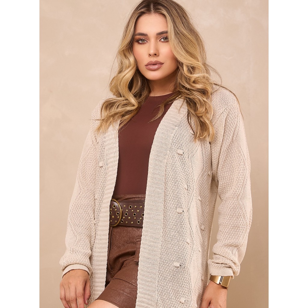 Lançamento – Cardigan com Bolinhas em Ponto Arroz Um verdadeiro encanto em forma de tricot. Nosso cardigan lançamento une o charme do ponto arroz com a delicadeza das bolinhas em alto relevo, criando uma peça atemporal e cheia de personalidade. Com toque leve, caimento fluido e visual sofisticado, ele é perfeito para quem busca um look delicado, mas com presença. Ideal para o dia a dia ou para produções mais elegantes — um cardigan versátil que veste com suavidade e estilo. Disponível em cores irresistíveis que valorizam o design rico do tricot. Composição: 100% Poliéster Tamanho: Tamanho único – veste do 38 ao 46 com conforto, graças à elasticidade das fibras. Medidas Aproximadas: Comprimento (ombro até a barra): 80 cm Largura do busto (entre cavas): 54 cm Altura da cava: 22 cm Comprimento da manga: 61 cm Peças artesanais podem apresentar variação de 1 a 2 cm. Cuidados e Lavagem: O tricot é uma peça delicada, siga as instruções de uso e lavagem para prolongar sua durabilidade do seu tricô. -Prefira lavar à mão, ao invés de usar máquinas de lavar. -Evite pendurar a peça no varal verticalmente. O peso da água pode causar deformações na roupa. -Consulte as indicações de temperatura na etiqueta antes de passar a peça. -Mantenha as peças dobradas, nunca pendurar