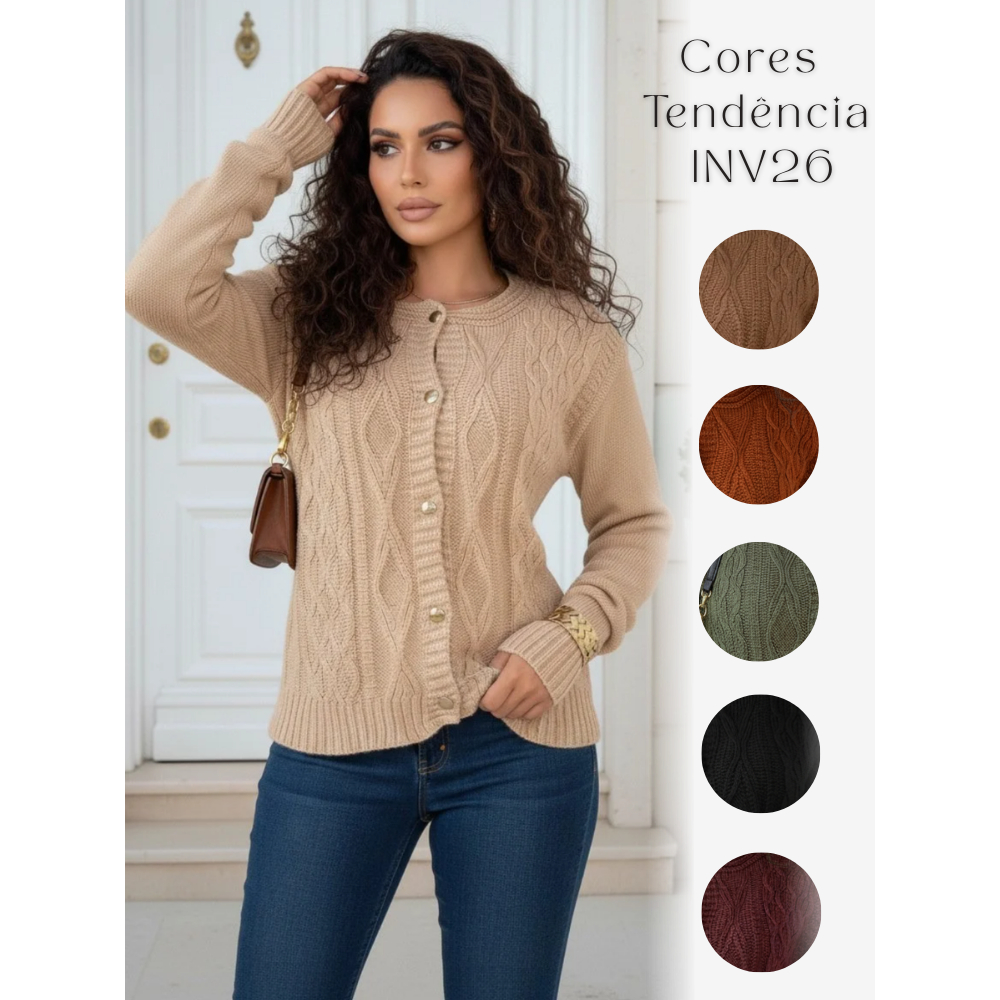 FOTOS REAIS DOS PRODUTOS. ENVIO IMEDIATO. -Detalhes do produto: Cardigan feminino em tricot com textura trançada e botões dourados que trazem sofisticação ao look. Possui modelagem confortável, mangas longas e acabamento canelado nos punhos e barra, garantindo melhor ajuste ao corpo. Perfeito para compor produções elegantes no dia a dia, trabalho ou ocasiões casuais. Combine com jeans, alfaiataria ou saia para um visual moderno e estiloso. 💖 Conforto + Elegância em uma única peça! Modelo: Cardigan feminino Material: Tricot (fio poliéster) Trama: Trabalhada em ponto trançado (cable knit) com texturas verticais Fechamento: Botões frontais dourados Gola: Redonda (decote careca) Manga: Longa Punhos e barra: Canelados Modelagem: Reta / levemente ajustada ao corpo Comprimento: Médio (altura do quadril) Estilo: Casual elegante Toque: Macio e confortável Elasticidade: Leve elasticidade natural do tricot