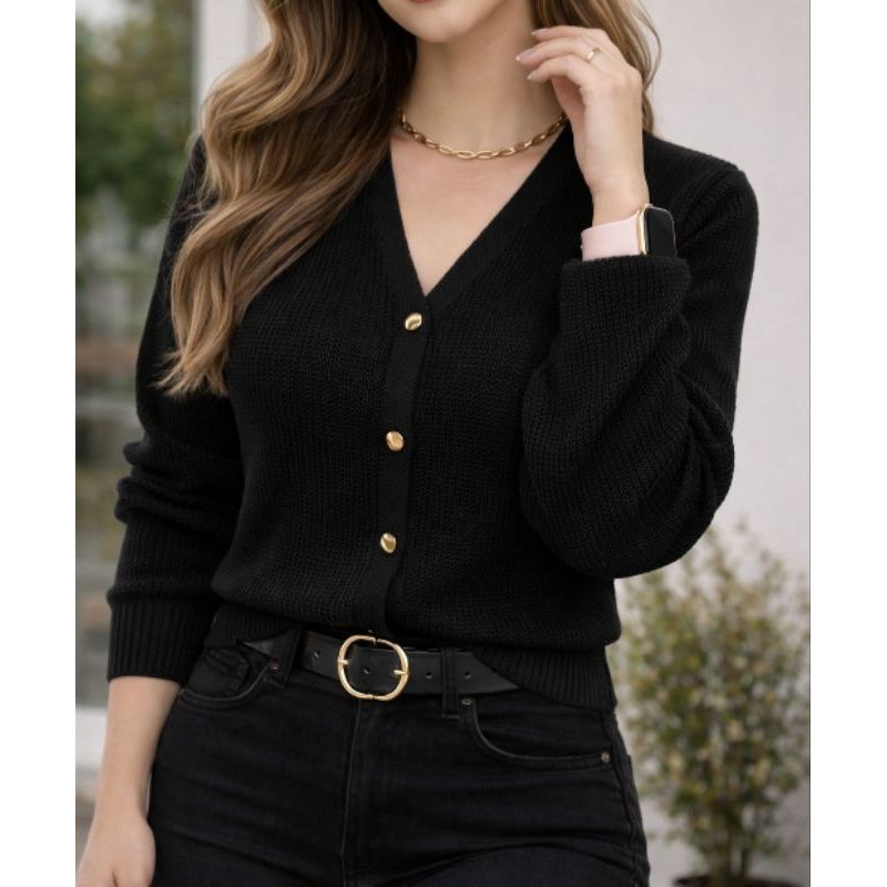 Cardigan Feminino Tricot Manga Longa Botões Dourados Inverno Elegante