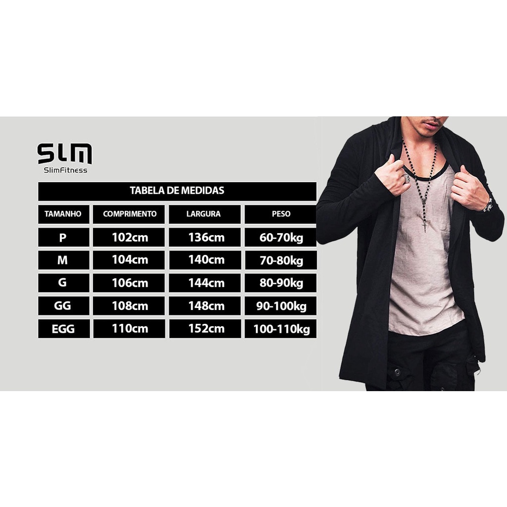 🧥✨ ESTILO MODERNO COM CAIMENTO IMPECÁVEL O cardigan masculino Slim Fitness é a escolha ideal para quem quer se proteger do frio sem abrir mão de um visual estiloso e atual. Uma peça versátil, perfeita para compor looks urbanos e casuais. 👔 DESIGN ALONGADO E ASSIMÉTRICO Com corte alongado e barra em ângulo, o cardigan cria um visual moderno e elegante, valorizando a silhueta e se adaptando bem a diferentes pessoas. Ideal para quem busca uma peça diferenciada no guarda-roupa. 💪 PRINCIPAIS BENEFÍCIOS ✔️ Visual moderno e sofisticado ✔️ Corte alongado que valoriza o corpo ✔️ Barra assimétrica estilosa ✔️ Confortável para uso diário ✔️ Fácil de combinar com diversos looks ✔️ Ideal para meia-estação e dias frios 🧵 MATERIAL E CONFORTO - Tecido confortável - Boa durabilidade - Toque agradável - Ótimo caimento 🎨 CORES DISPONÍVEIS - Preto - Bege - Cinza - Marinho (Conforme disponibilidade do anúncio) 📏 TABELA DE MEDIDAS Tamanho | Comprimento | Largura | Manga | Peso P | 102cm | 136cm | 66cm | 60-70kg M | 104cm | 140cm | 68cm | 70-80kg G | 106cm | 144cm | 70cm | 80-90kg GG | 108cm | 148cm | 72cm | 90-100kg EGG | 110cm | 152cm | 74cm | 100-110kg ⚠️ ATENÇÃO As imagens deste anúncio são protegidas por direitos autorais. Qualquer uso indevido está sujeito a medidas legais.