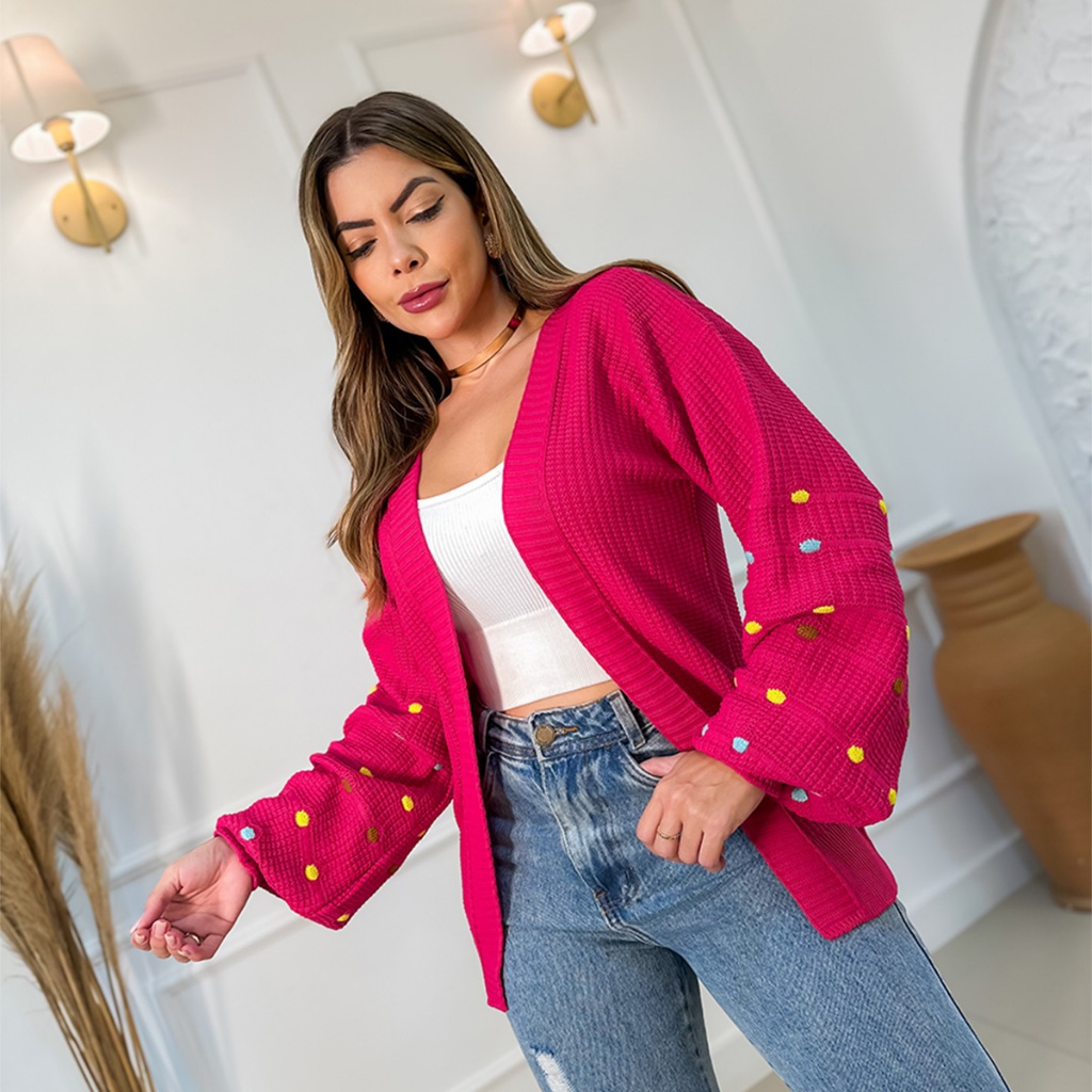 Cardigan Tricot Tricô Grosso Longo Com Detalhe Manga Colorida